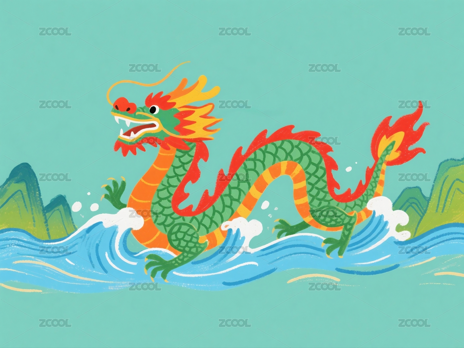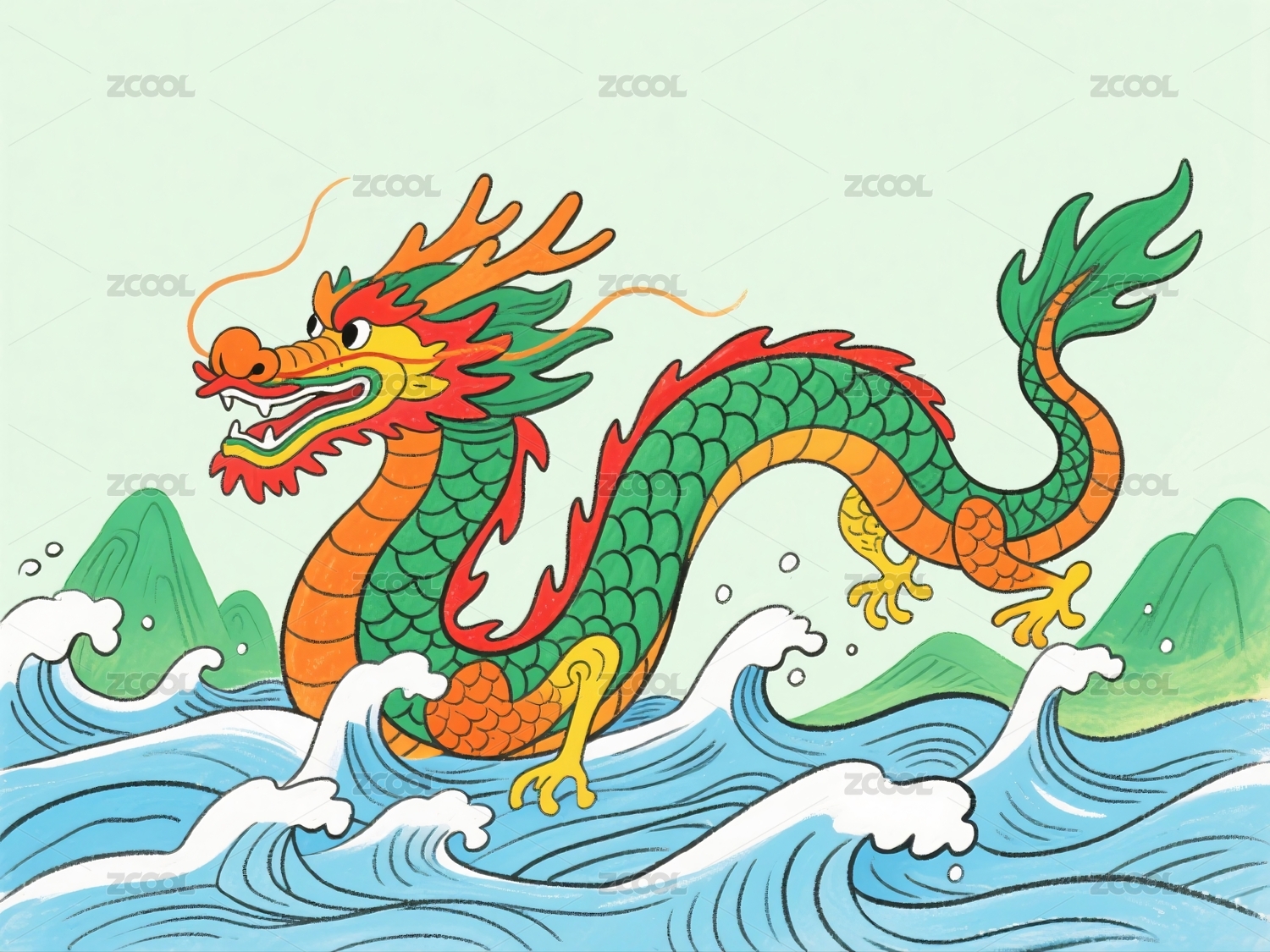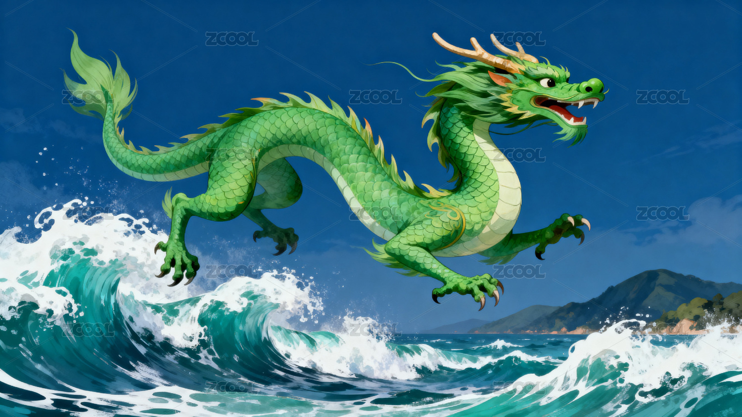 绘画,自然,绿色,动态,蓝天,山峰,巨龙,飞腾,海浪,鳞片