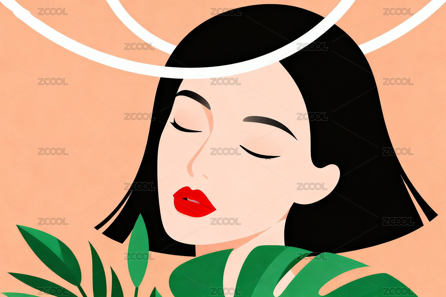 闭眼女子头戴光环绿叶环绕