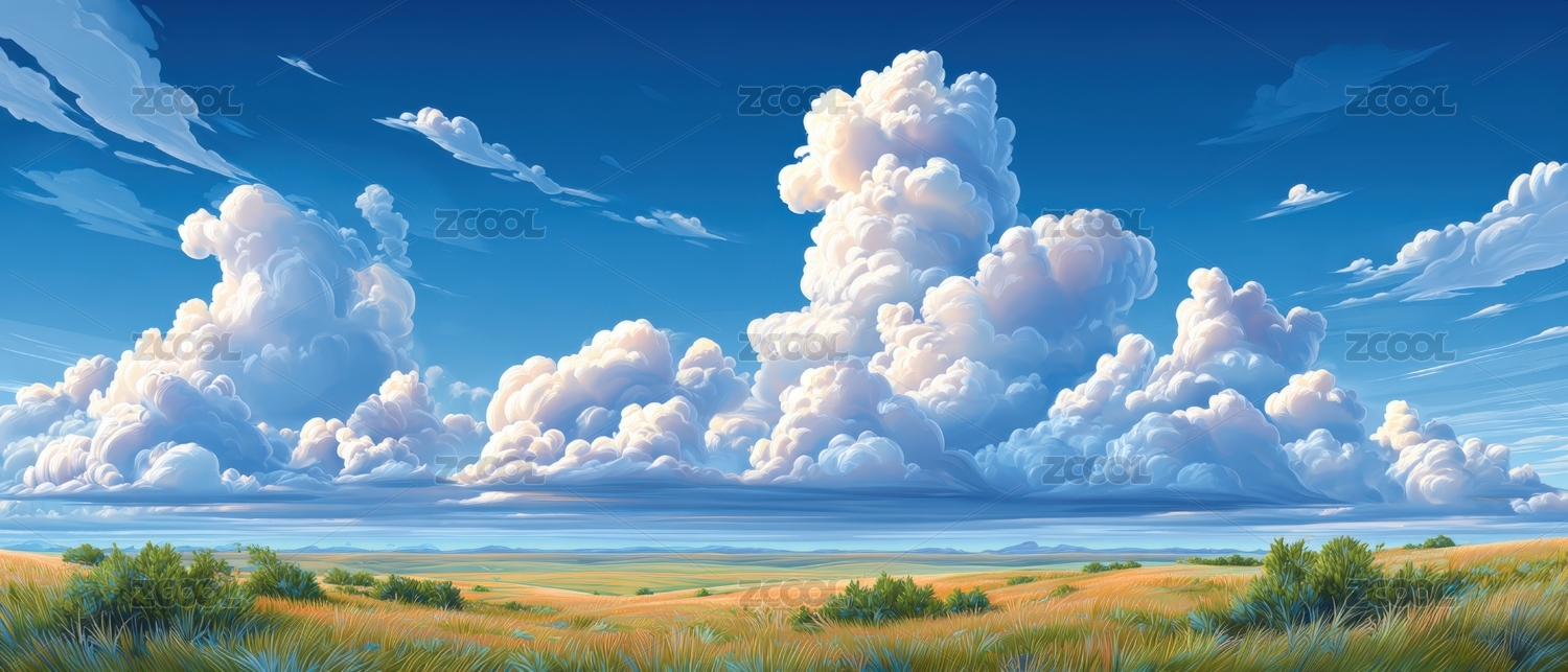 蓝天白云云彩下草丛草原手绘水彩插画