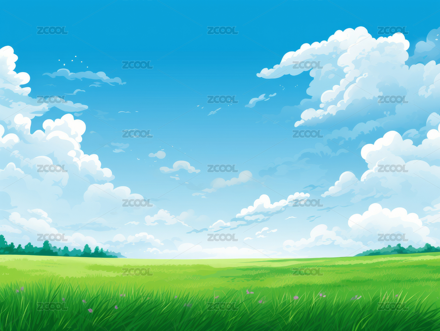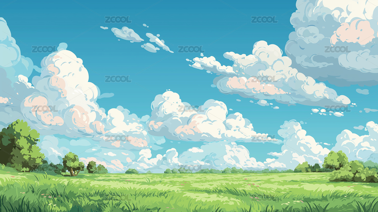 蓝天云朵下绿色草地清新治愈系动漫风景插画