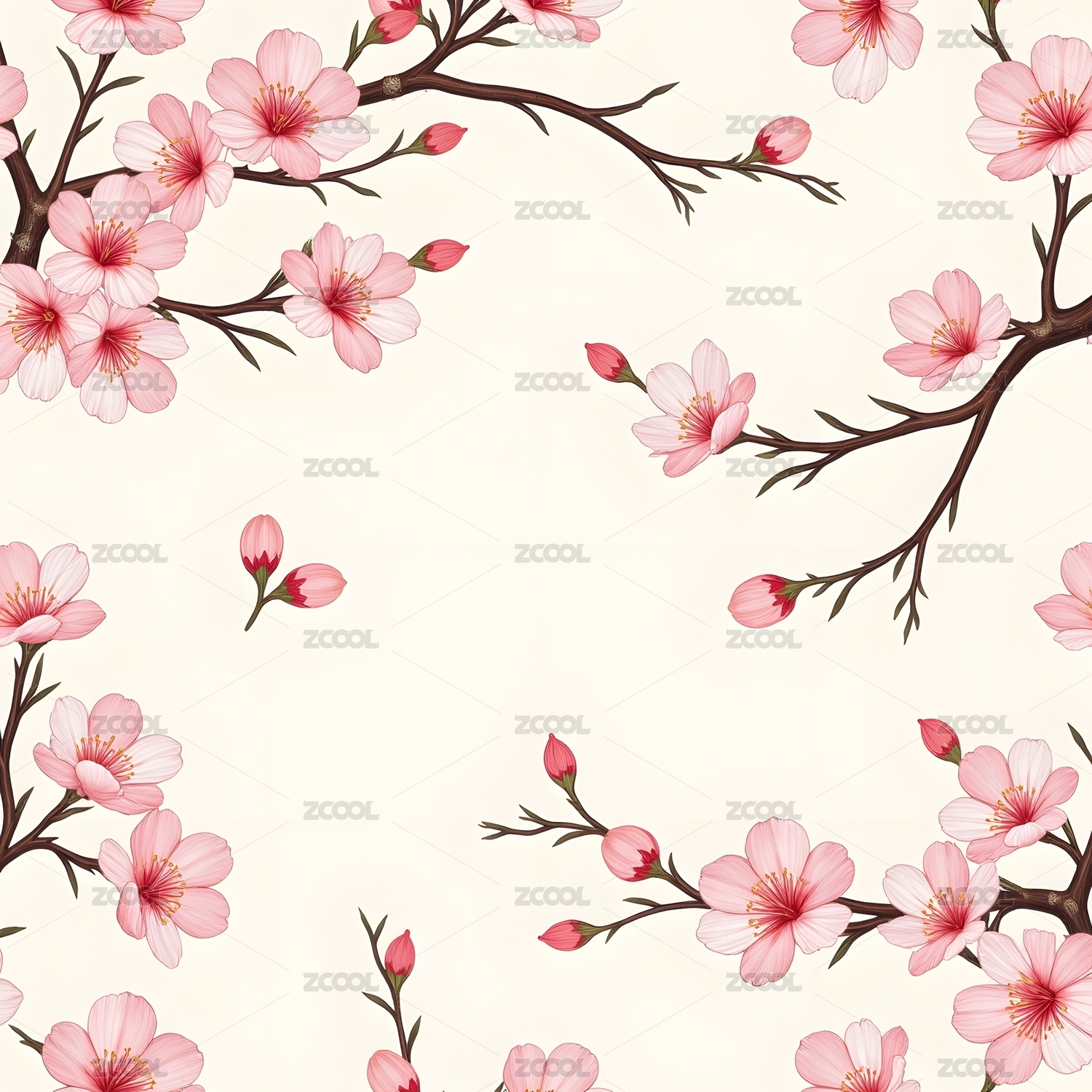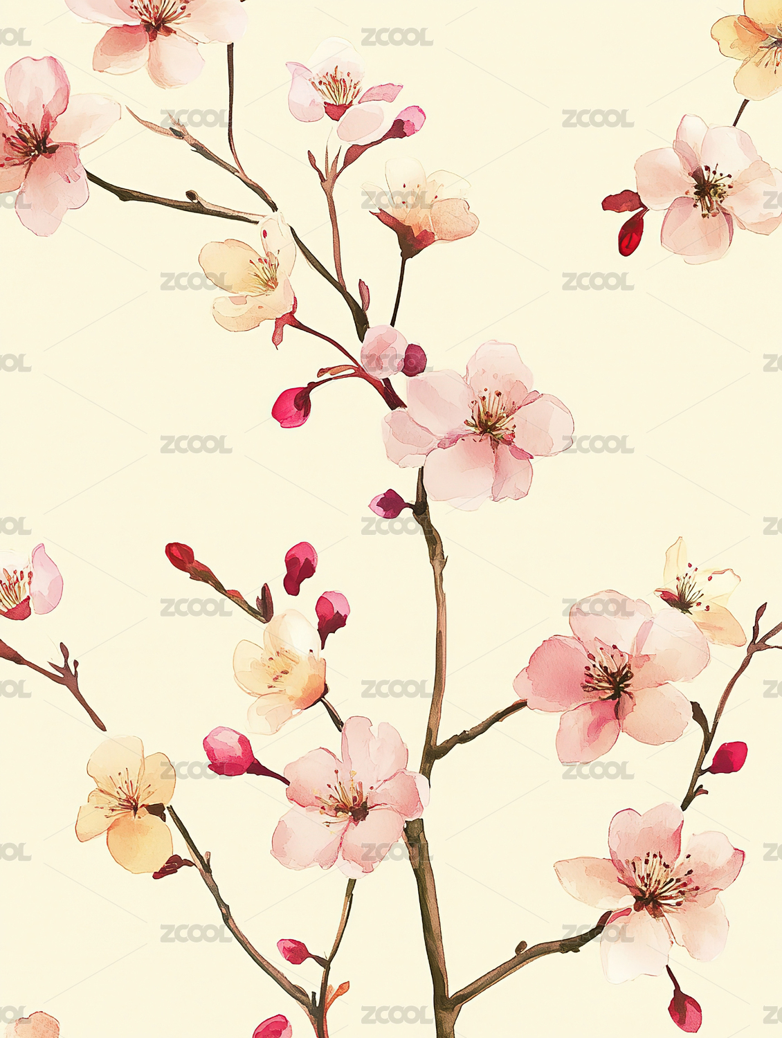 浅粉色桃花花枝植物水彩无缝图案纹理