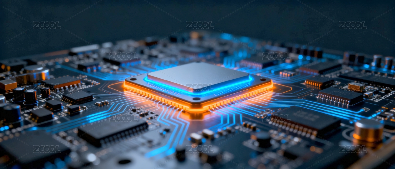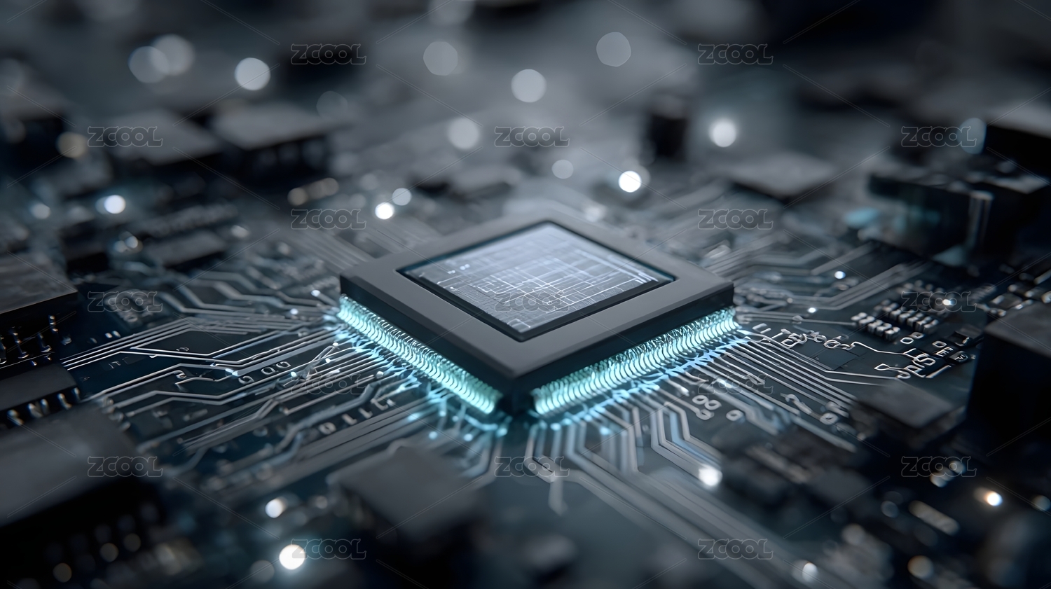 全息科技感芯片在蓝色光效中呈现电路数据流