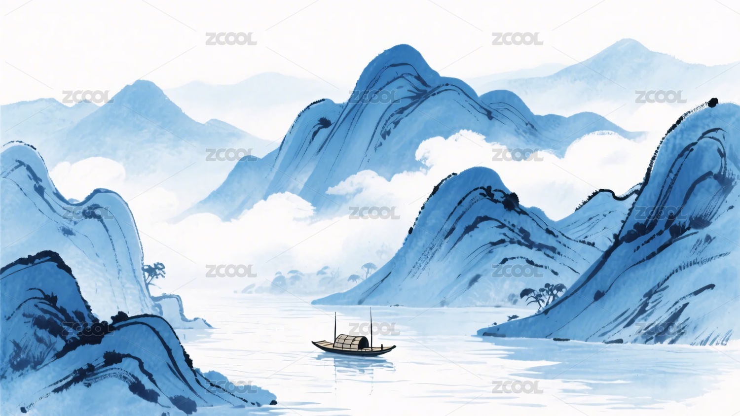 山水,孤舟,云雾,插画,古风,自然,景色,水墨画,意境,中式