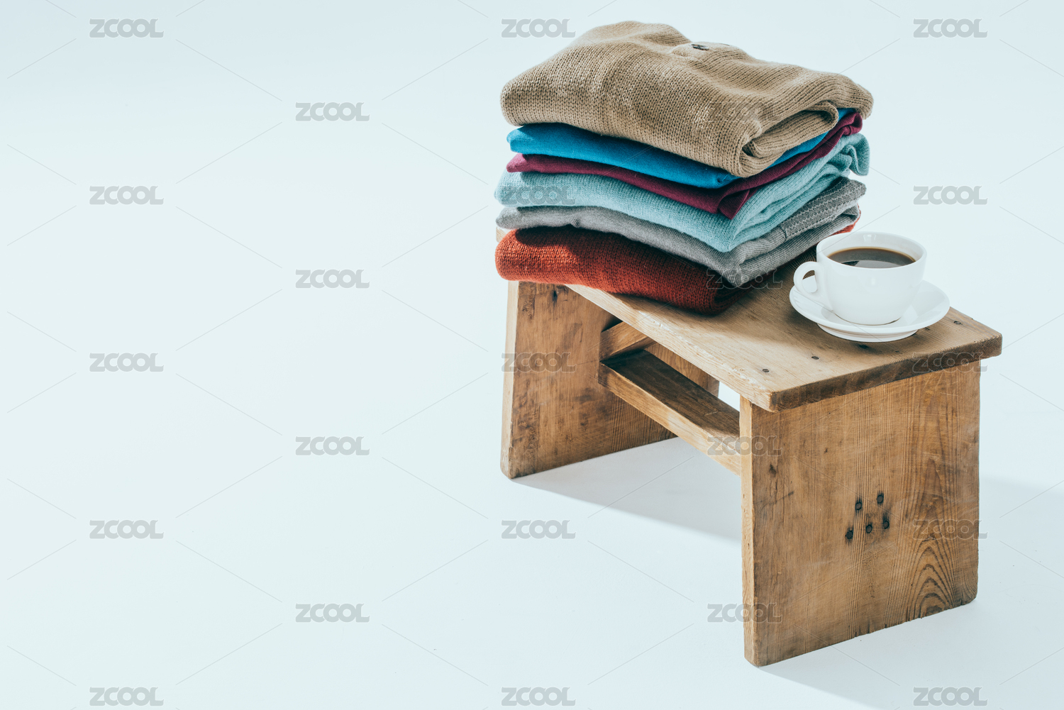 冬季毛衣的堆栈和咖啡厅在白色背景上的土气长凳