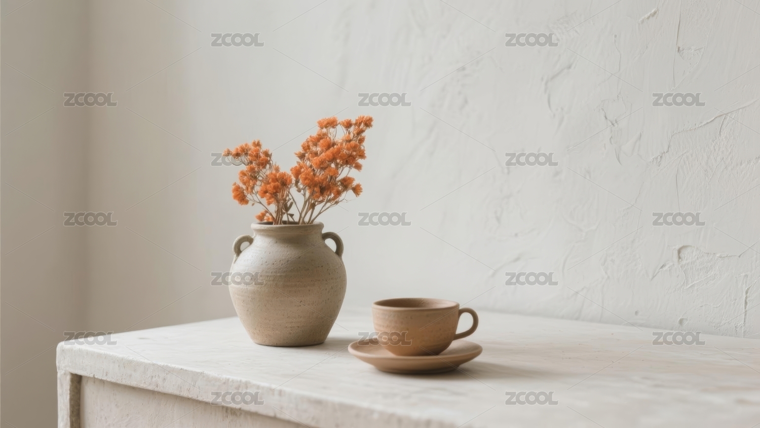 浅棕背景绿植旁带杯垫陶瓷杯静物场景