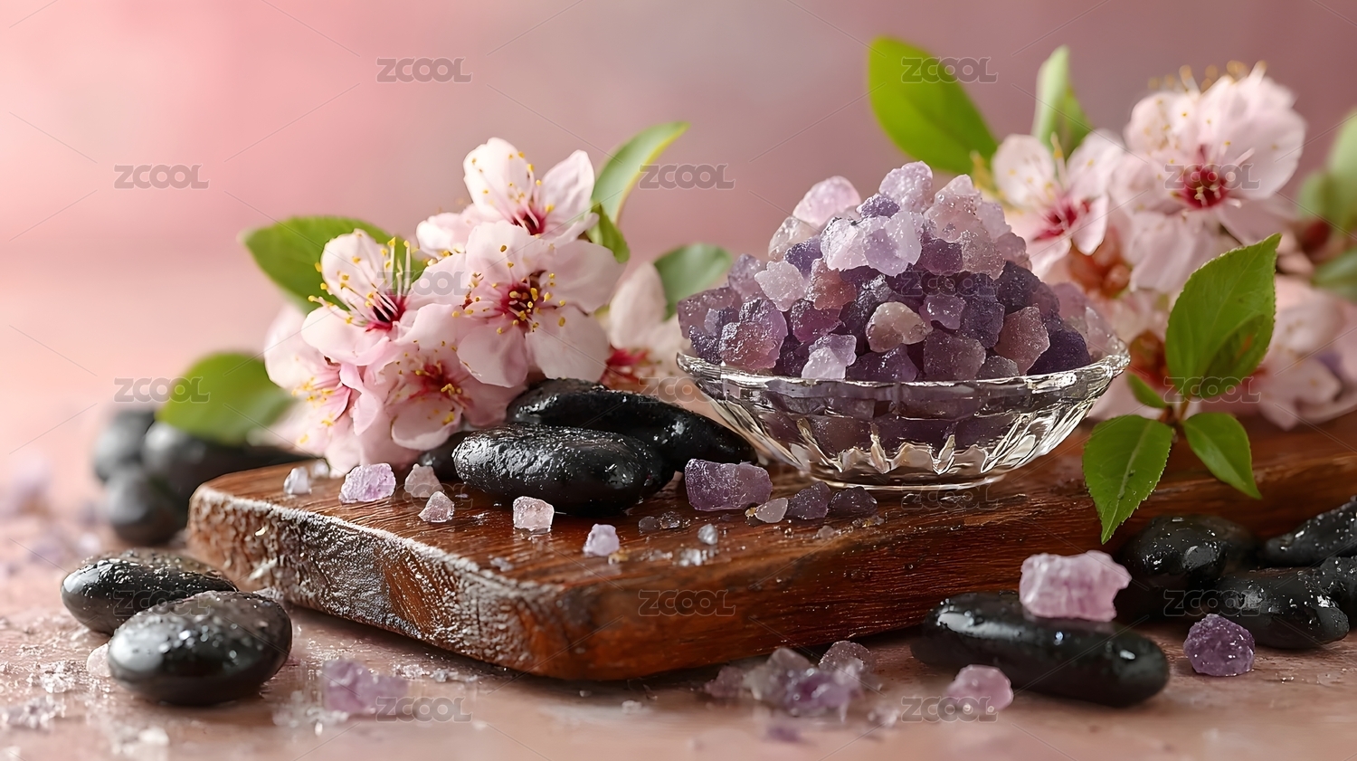 紫色浴盐搭配樱花与黑石的静谧场景