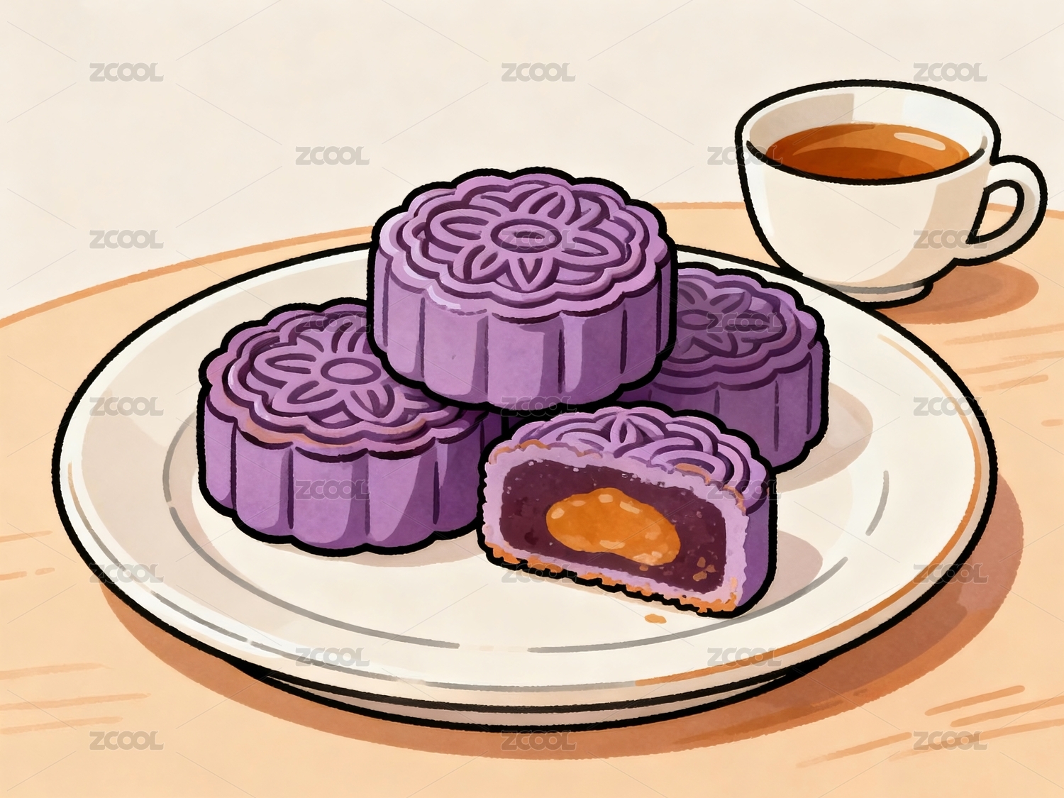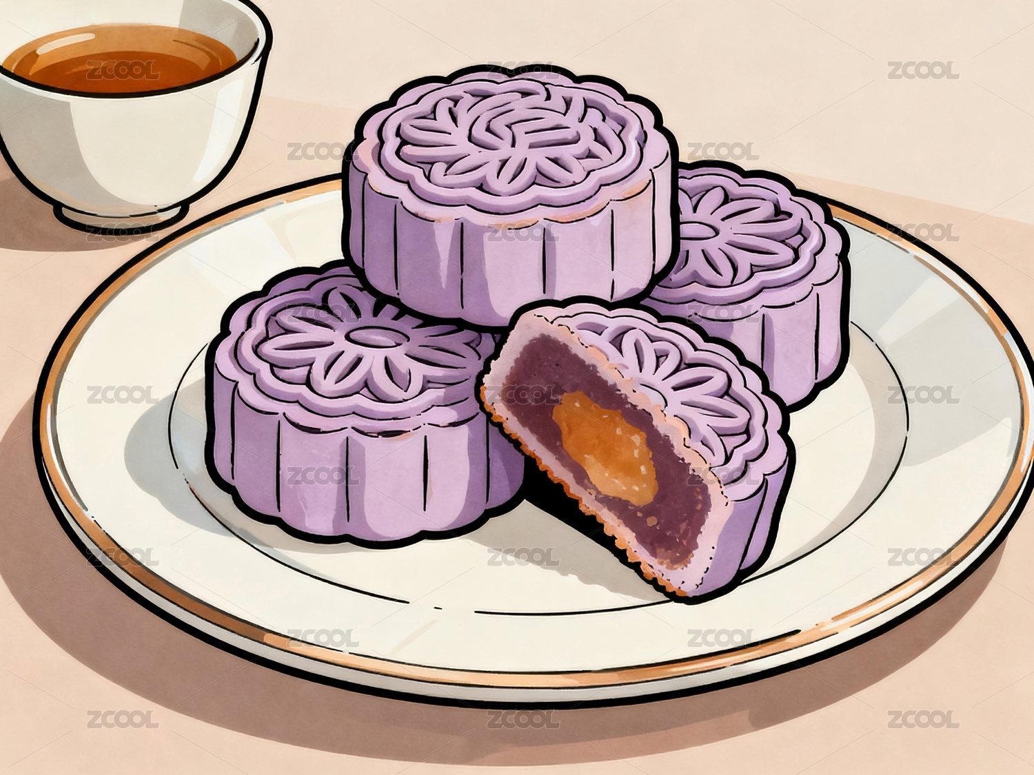 月饼,紫色,茶杯,碟子,茶水,食物,糕点,中秋,节日,圆形