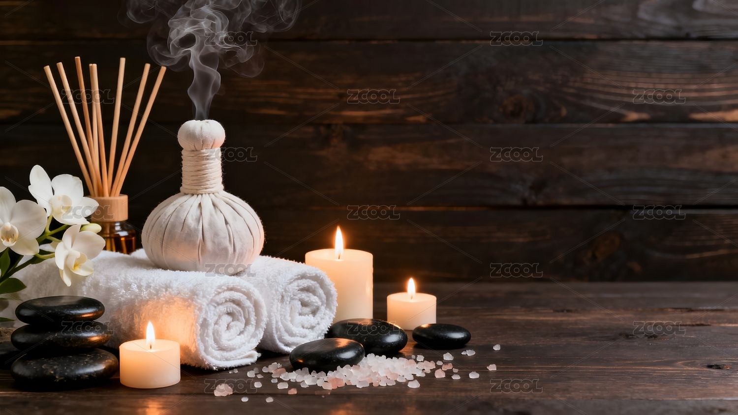 毛巾,蜡烛,木桌,花瓣,白色,瓶口,盐粒,花朵,木纹,透明