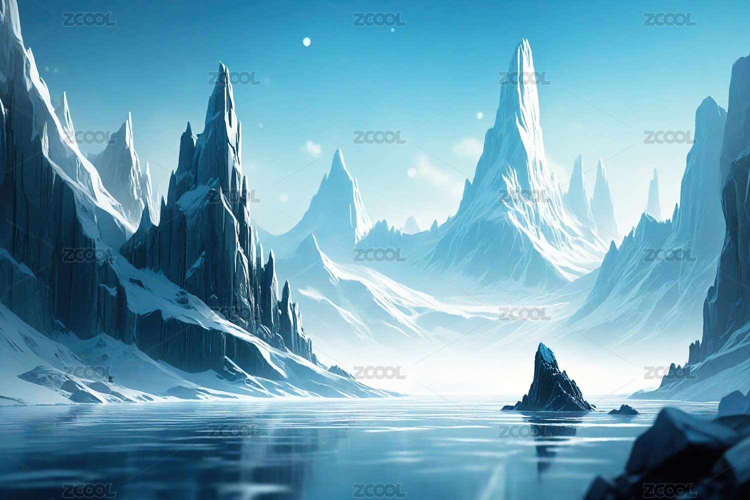 超现实山脉湖泊梦幻冰山草地3D渲染背景