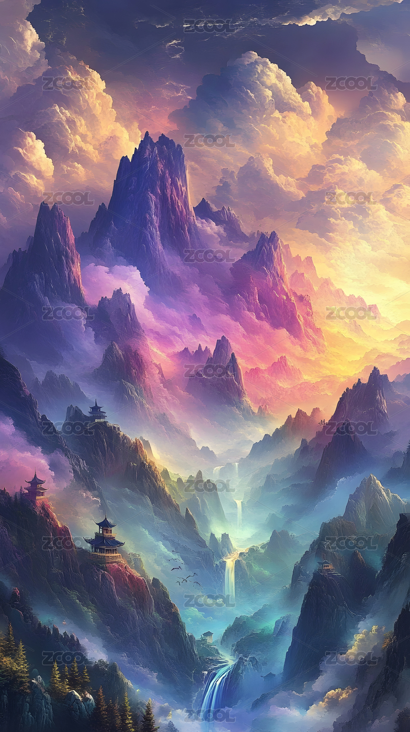 梦幻仙境山川瀑布寺庙