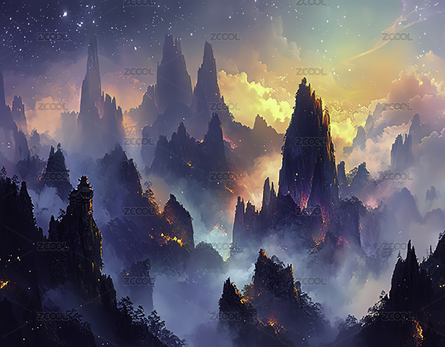 悬浮山峰与紫色云海