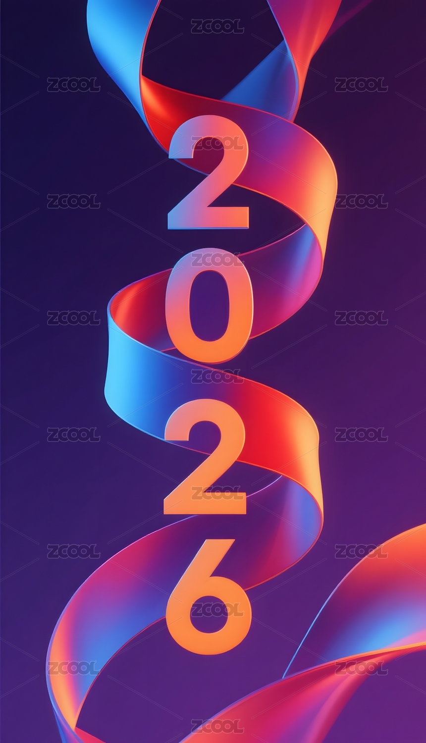 数字,2026,红色,蓝色,紫色,光影,曲线,造型,渐变,表面