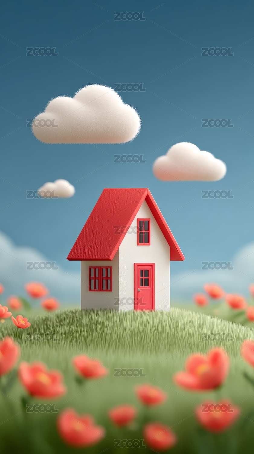 红色,橙色,花朵,明亮,生机,小屋,蓝天,白云,童趣,户外