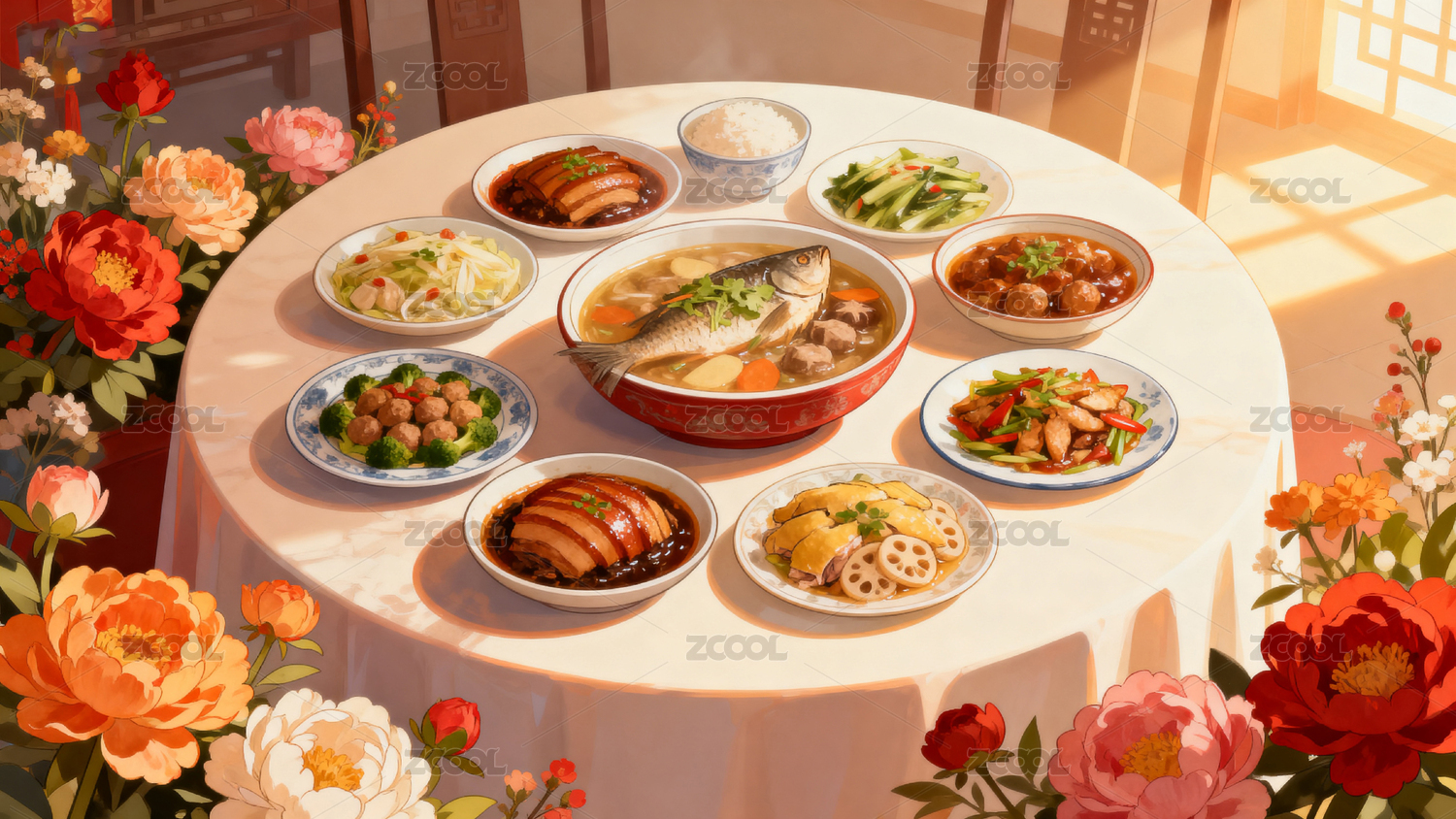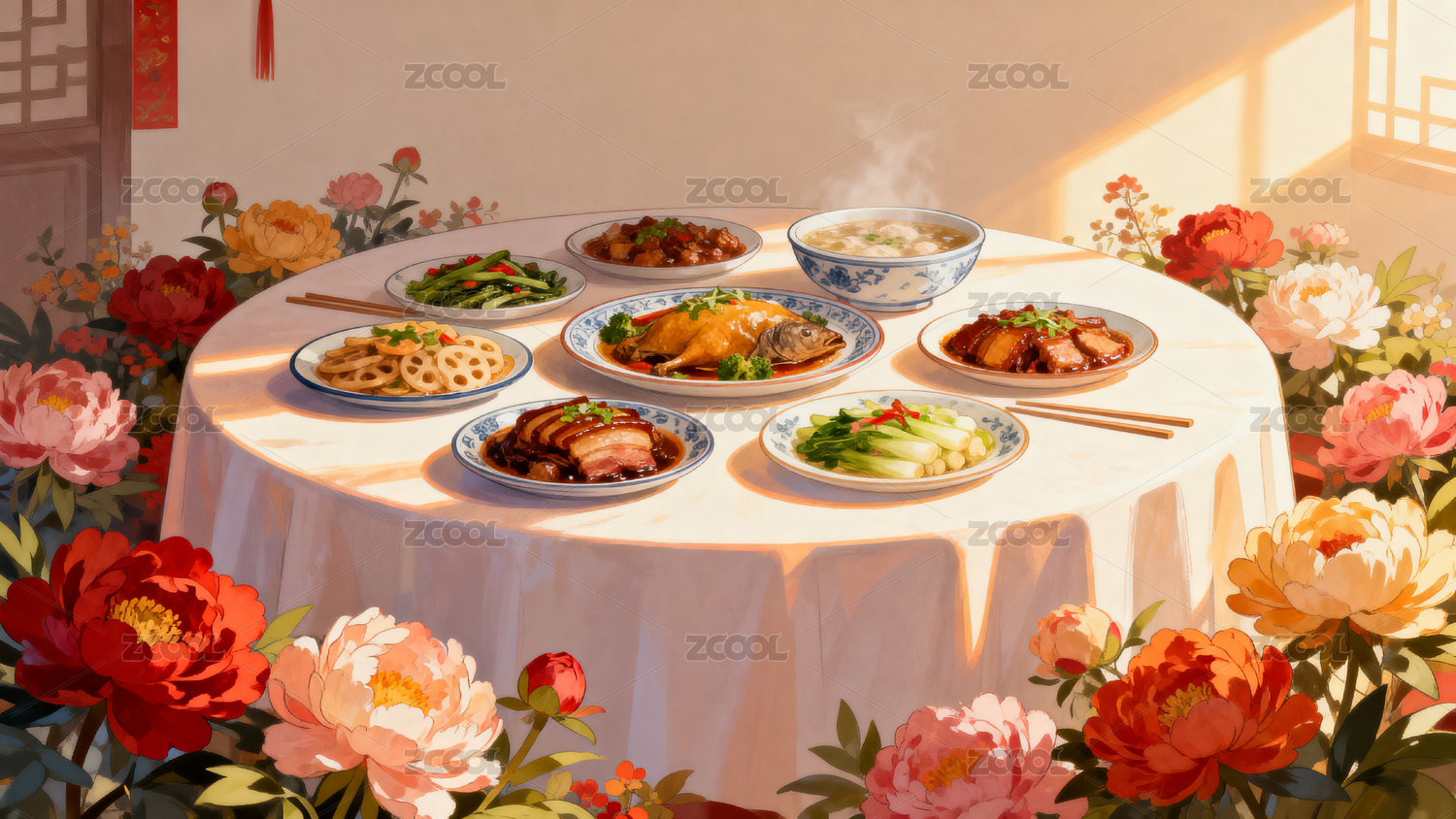 一桌丰盛的中国菜传统晚宴的中国风喜庆插画