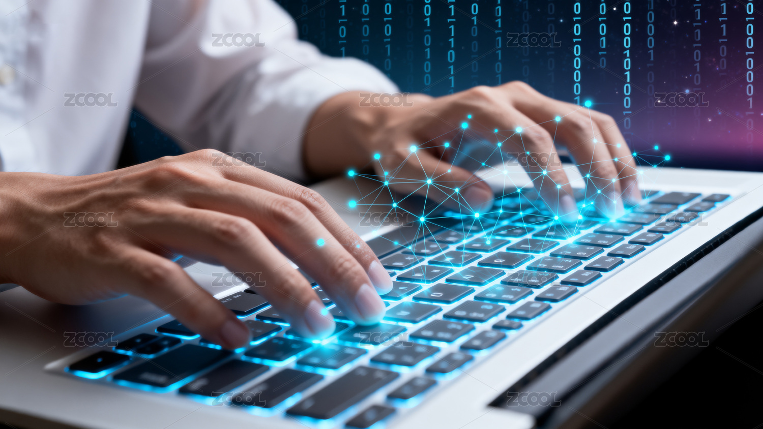 双手操作发光键盘的科技场景