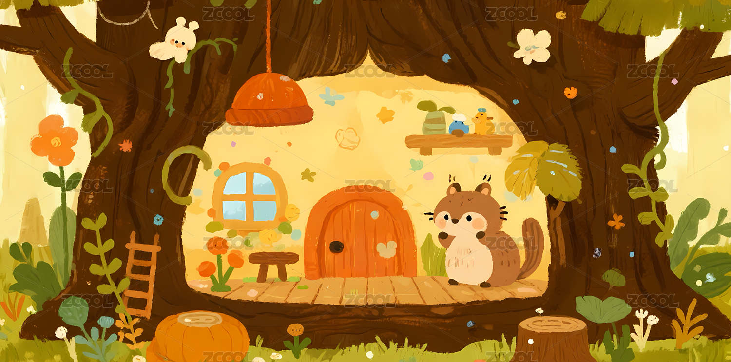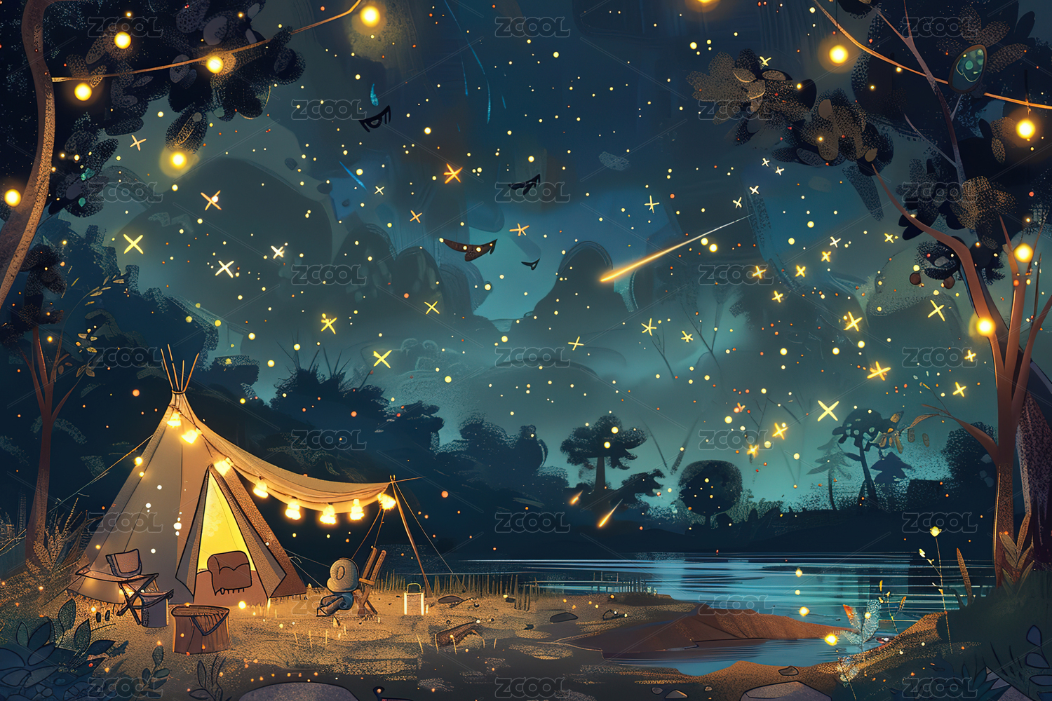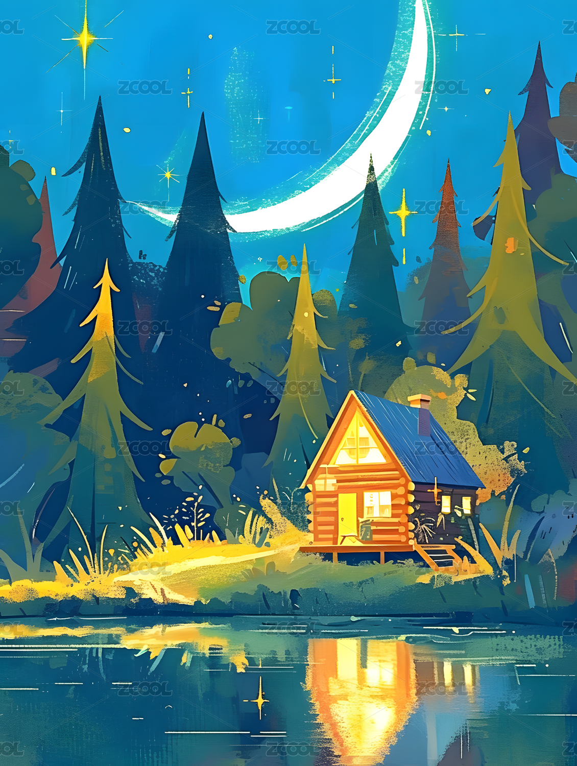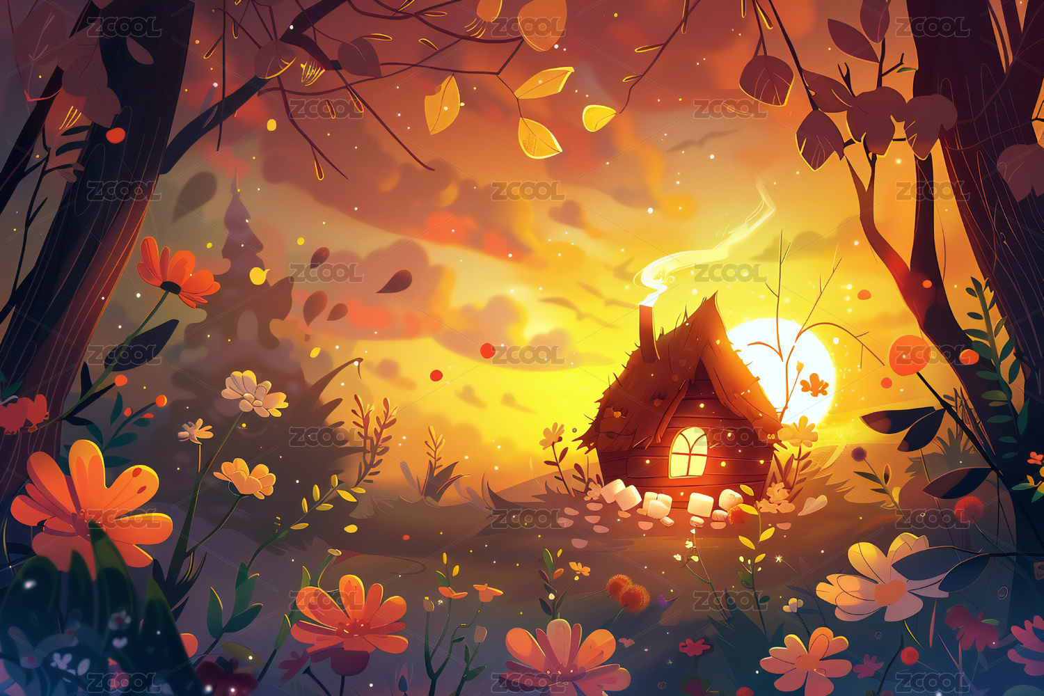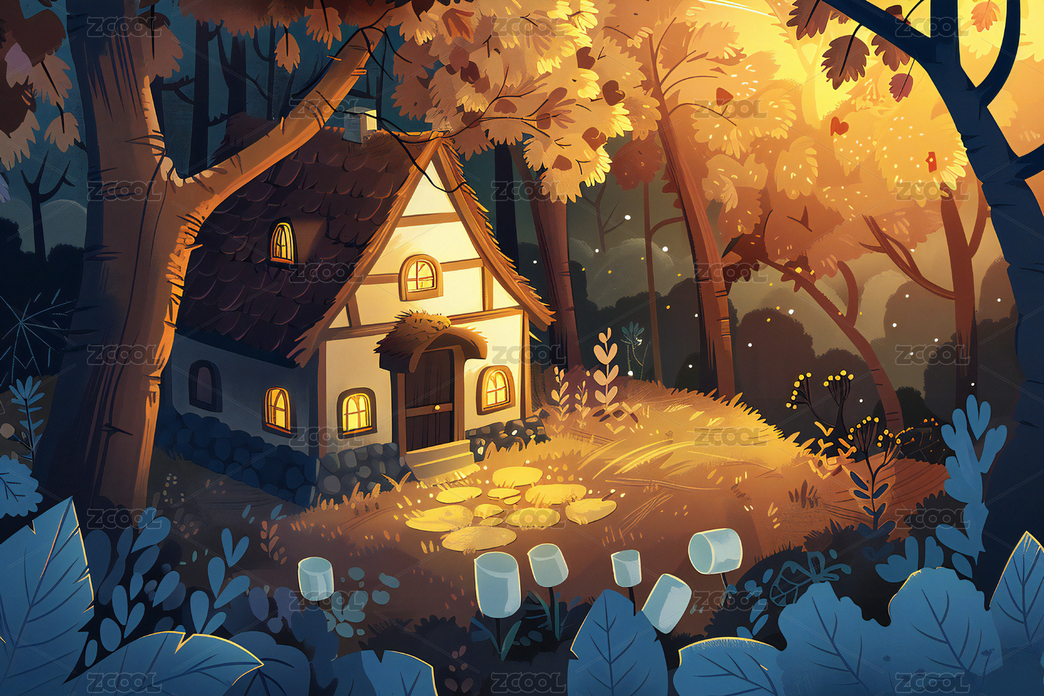 森林,小屋,夜晚,灯光,花园,动物,星星,彩旗,木屋,童话