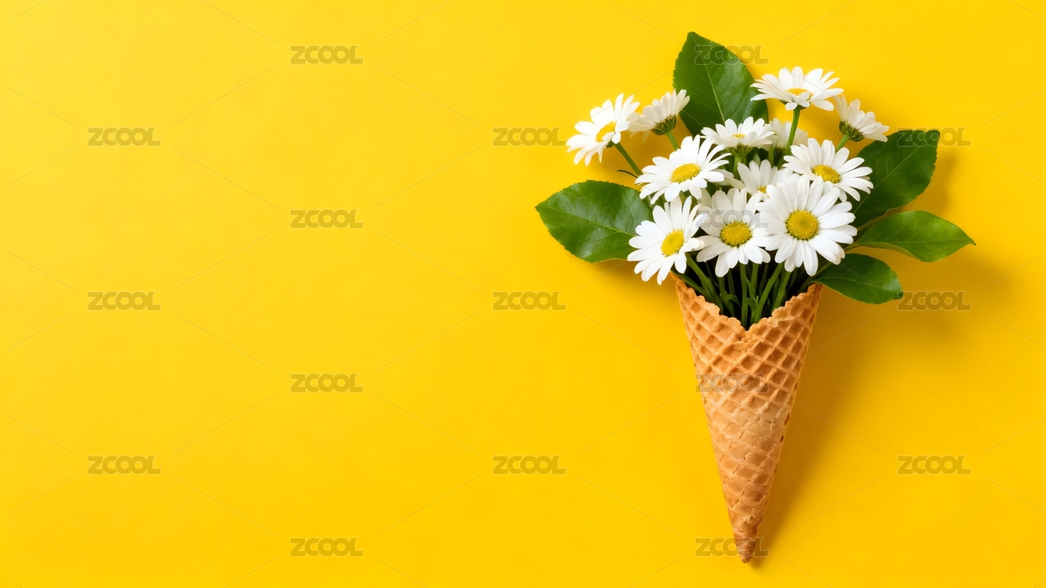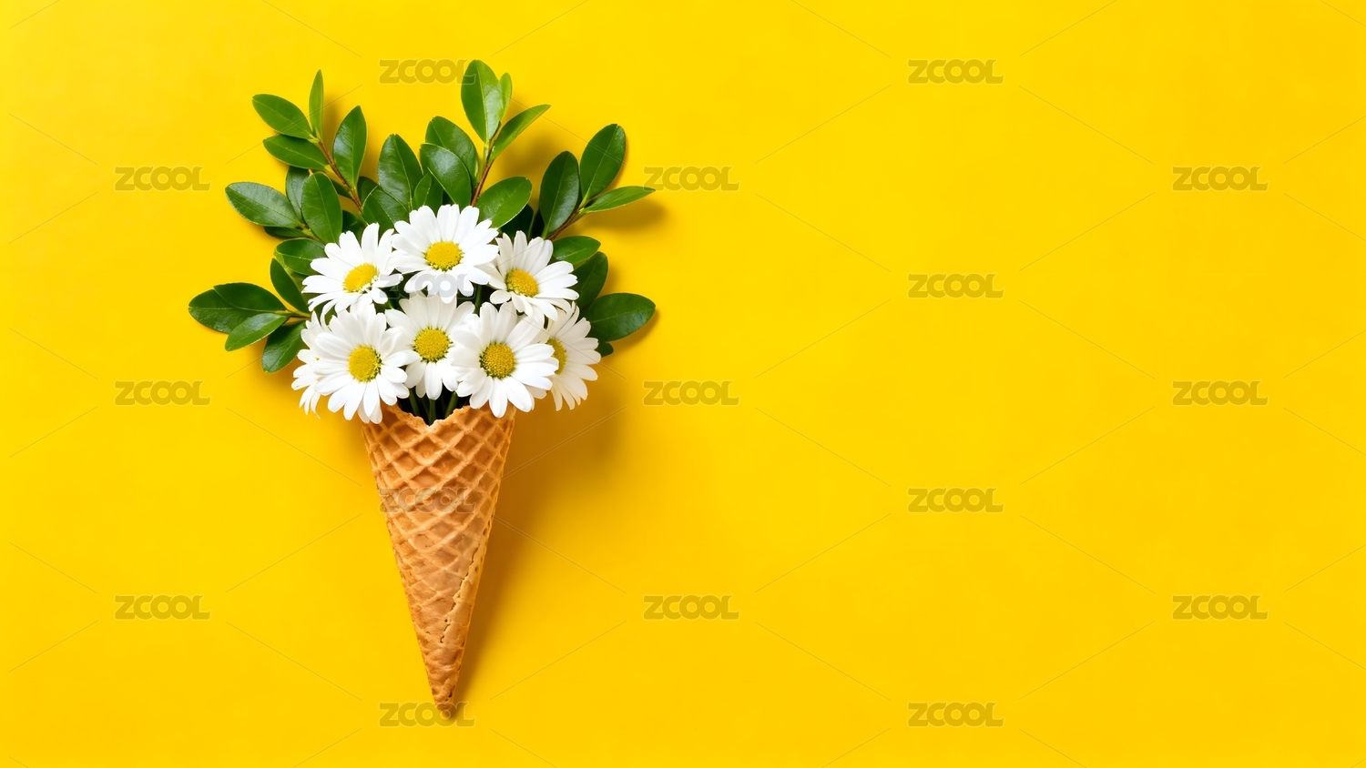 冰淇淋筒插满雏菊绿叶