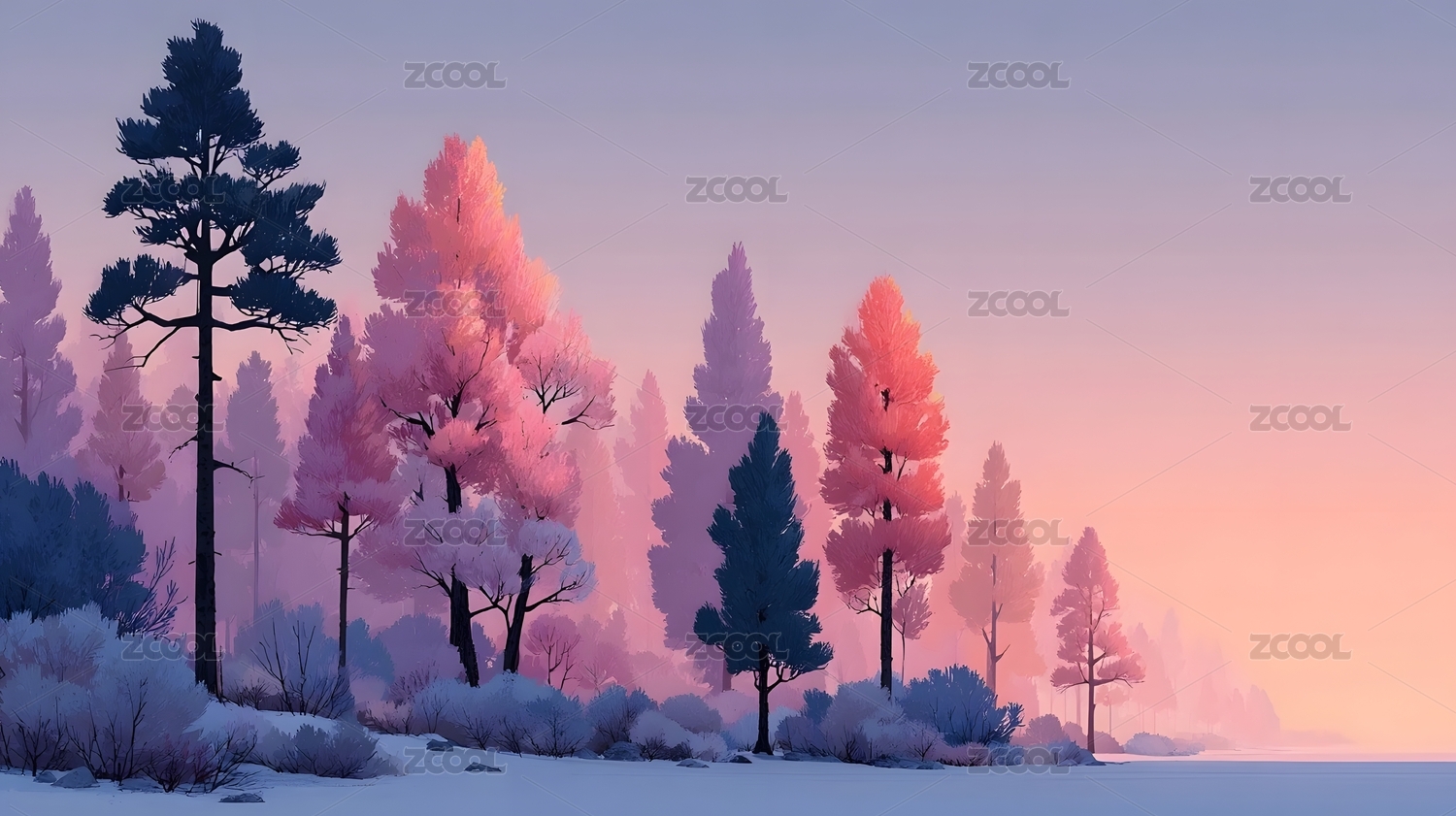 清新明亮冬天有厚厚的积雪的树林插画绘画