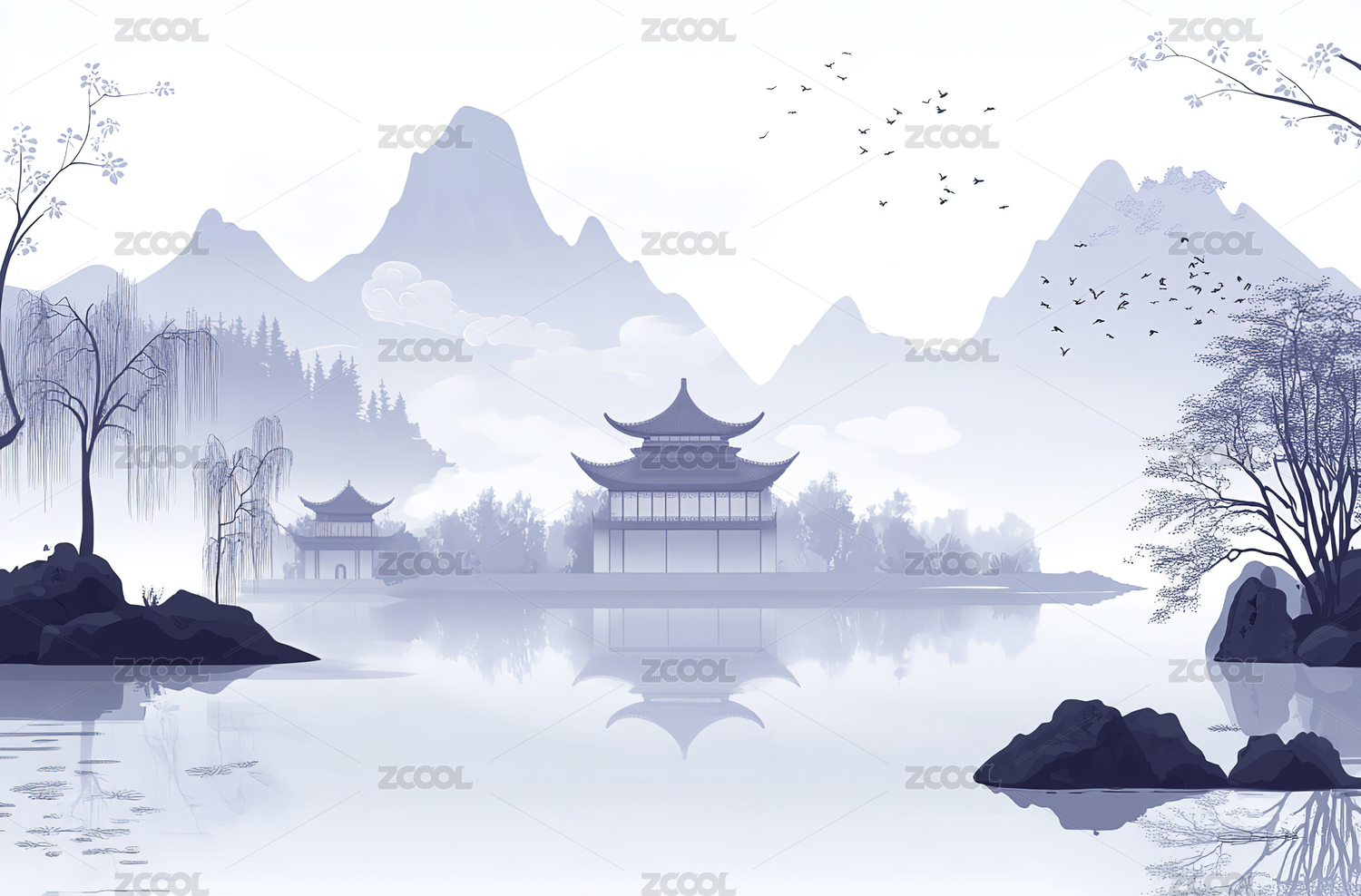 蓝色,山水画,中国画,水墨画,凉亭,建筑,反射,鸟,树,云
