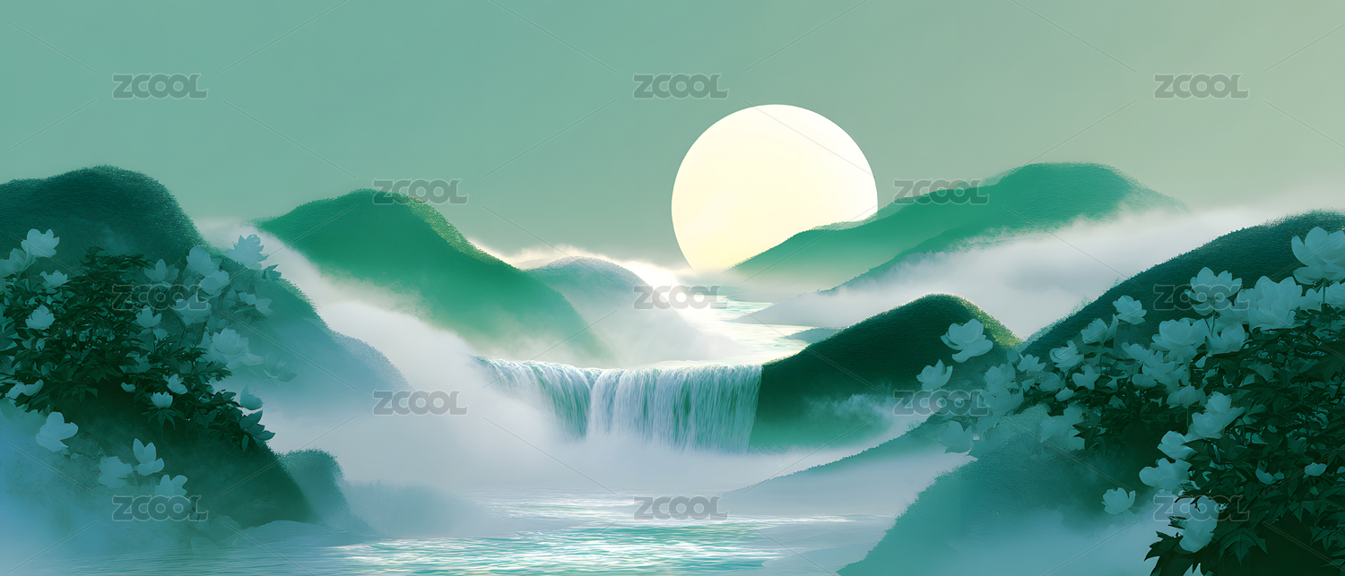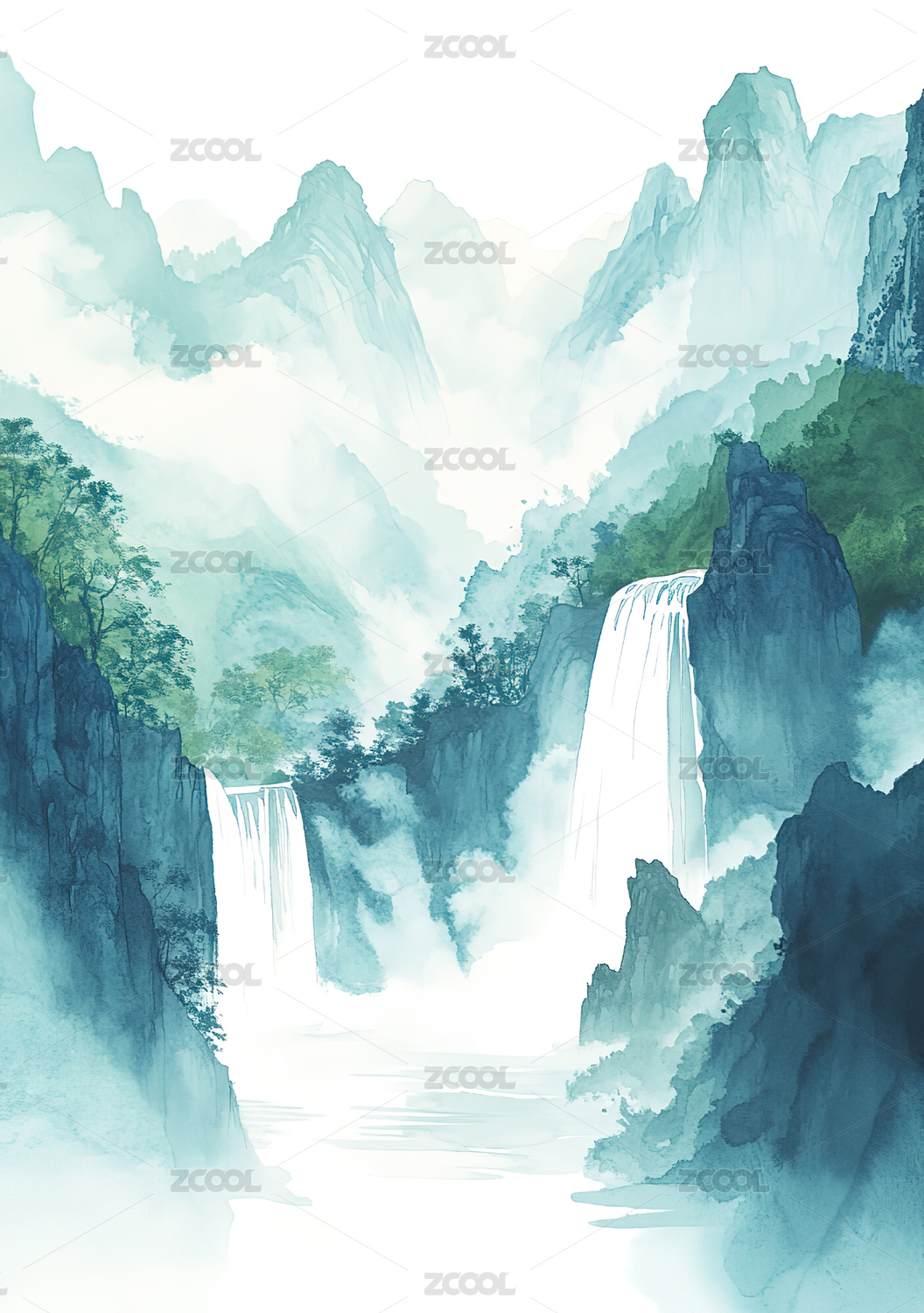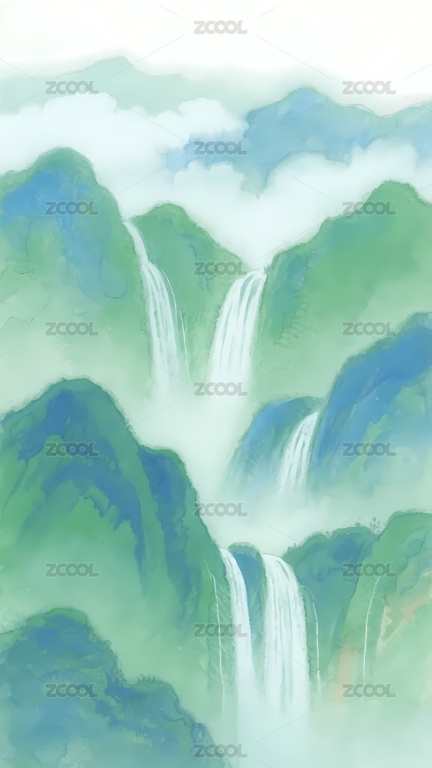 绿色,自然,宁静,清新,天空,山峦,瀑布,风景,流水,远山