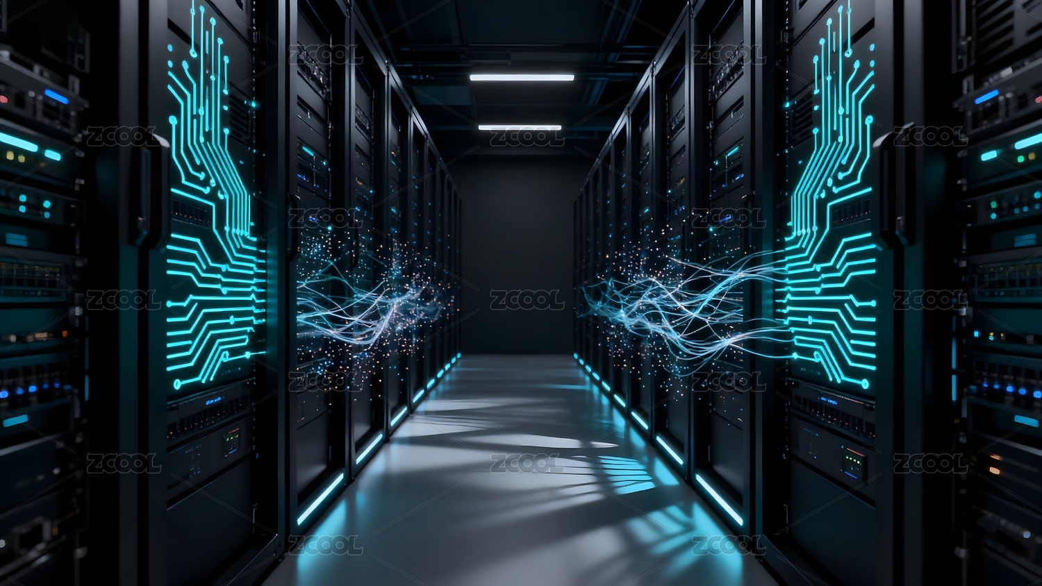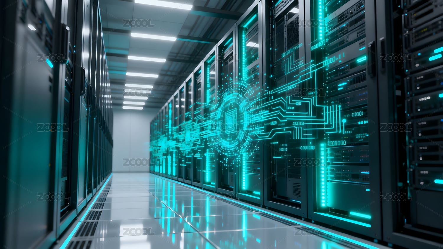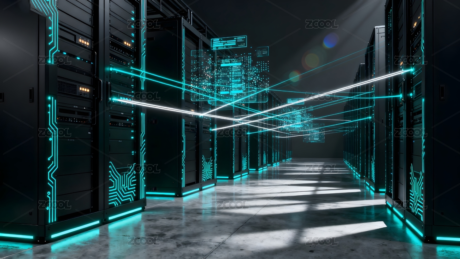 三维渲染的现代化高科技的服务器机房,强大的数据库和运算存储能力。
