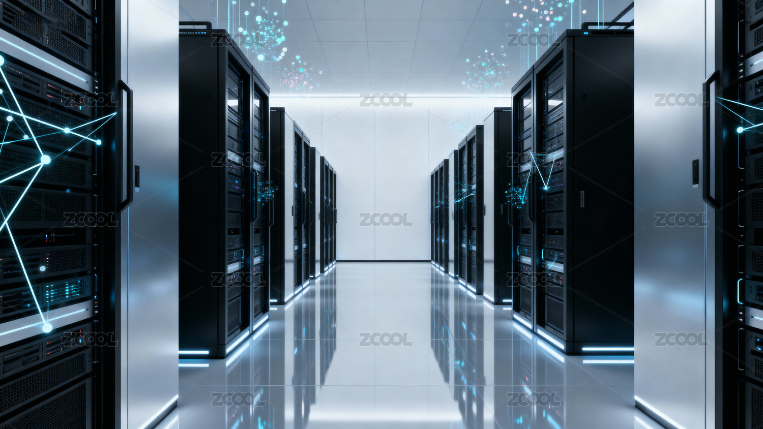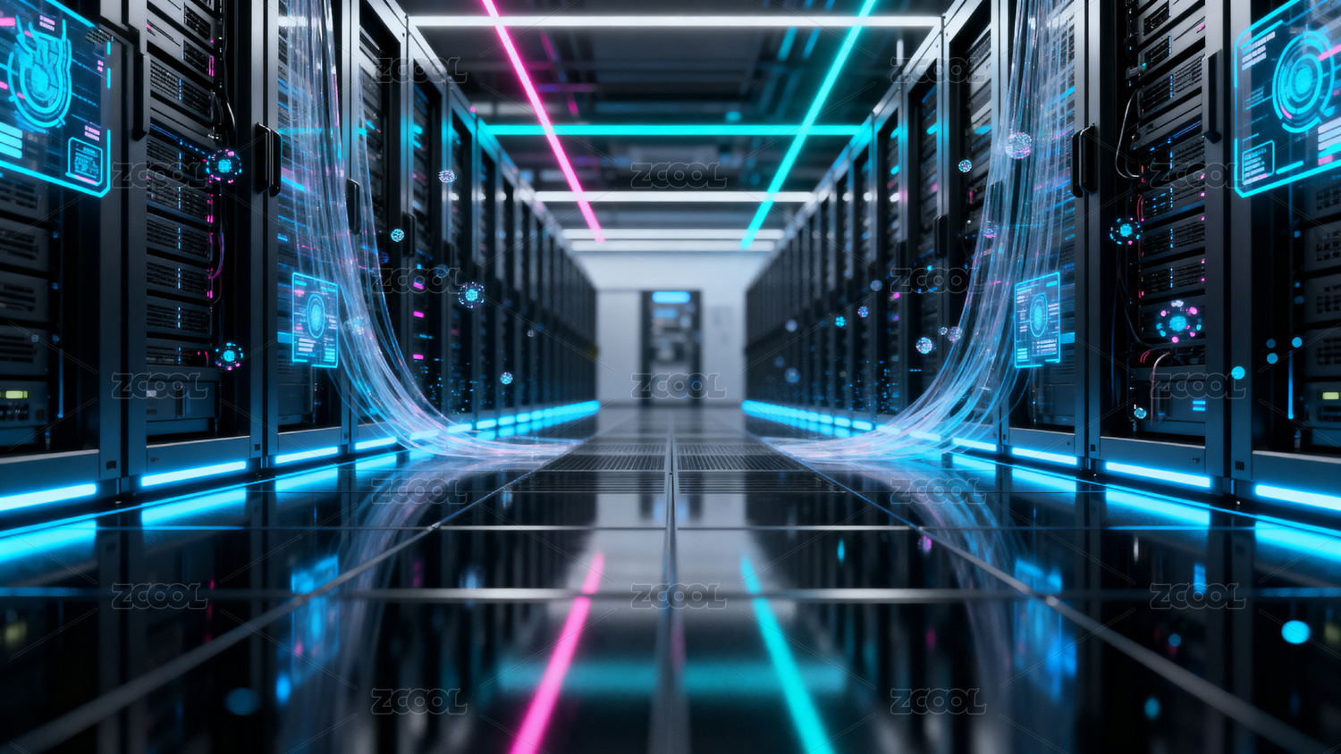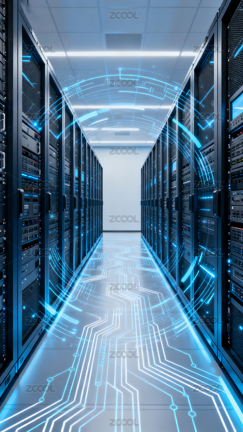三维渲染的现代化高科技的服务器机房,强大的数据库和运算存储能力。