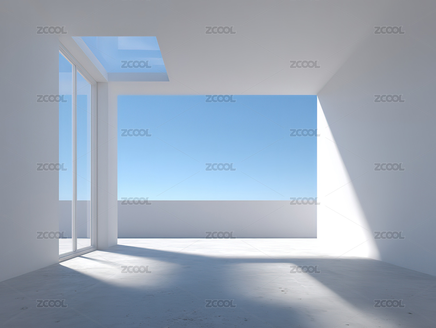 滨海白色有大落地窗室内空间光影三维渲染