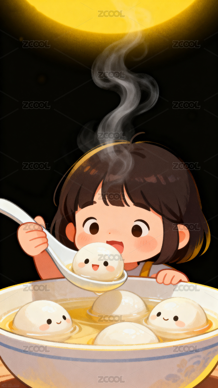 红色,衣服,女孩,头发,汤圆,碗,勺子,图案,餐具,食物