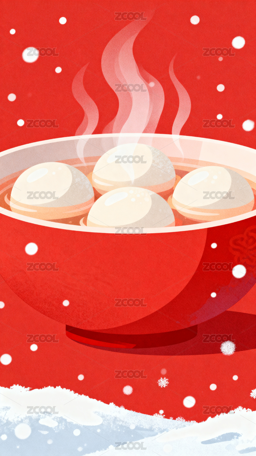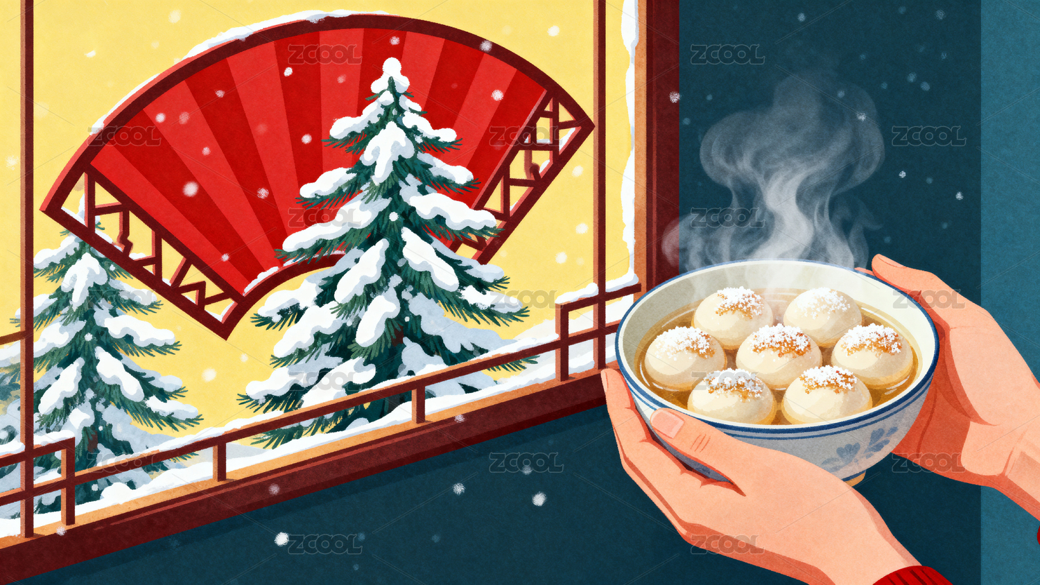 红色,云,夜,松树,汤圆,碗,热气,蒸汽,雪,窗户