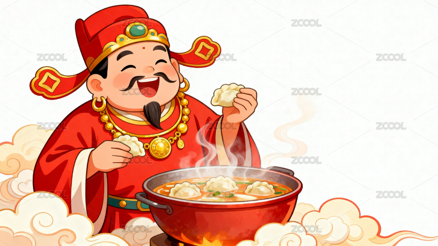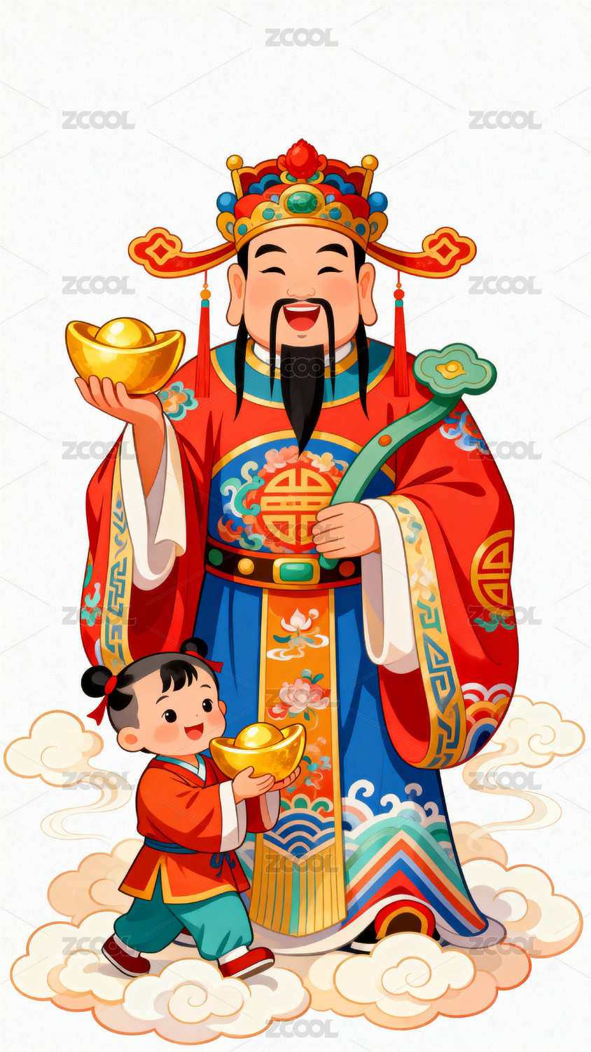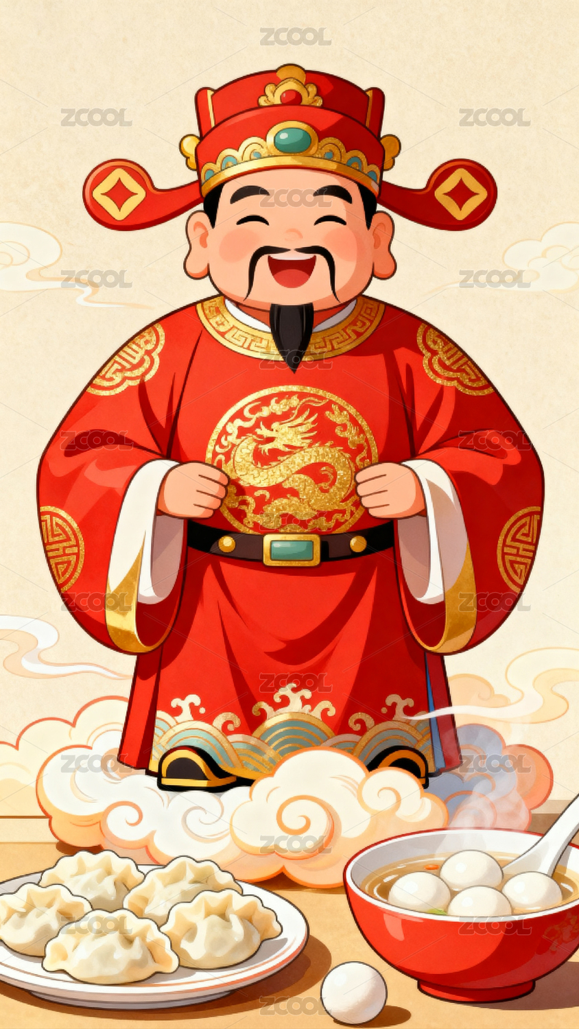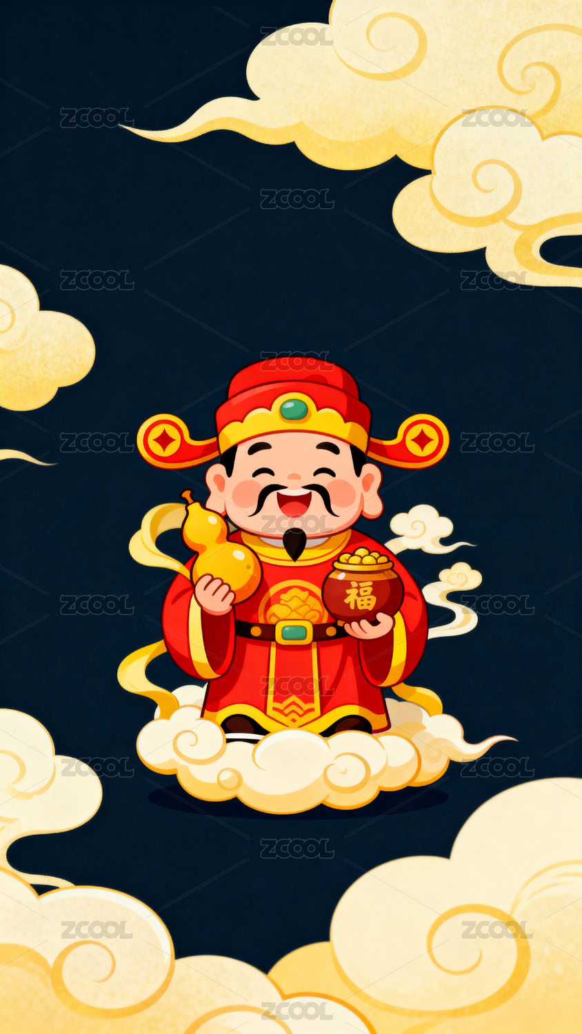 财神,帽子,元宝,服饰,传统,喜庆,云,笑容,食物,热气