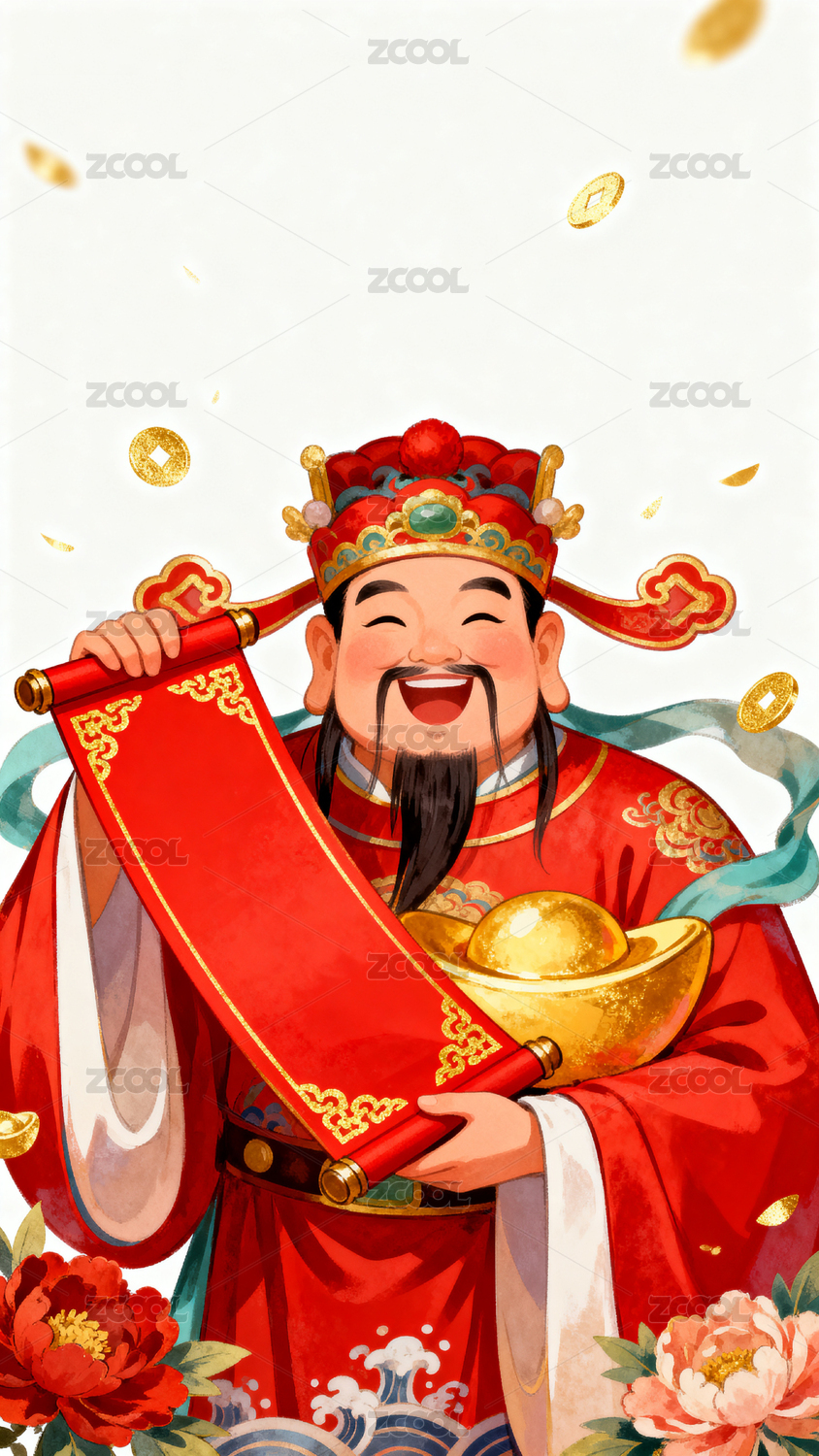 财神爷手持金元宝喜庆画面