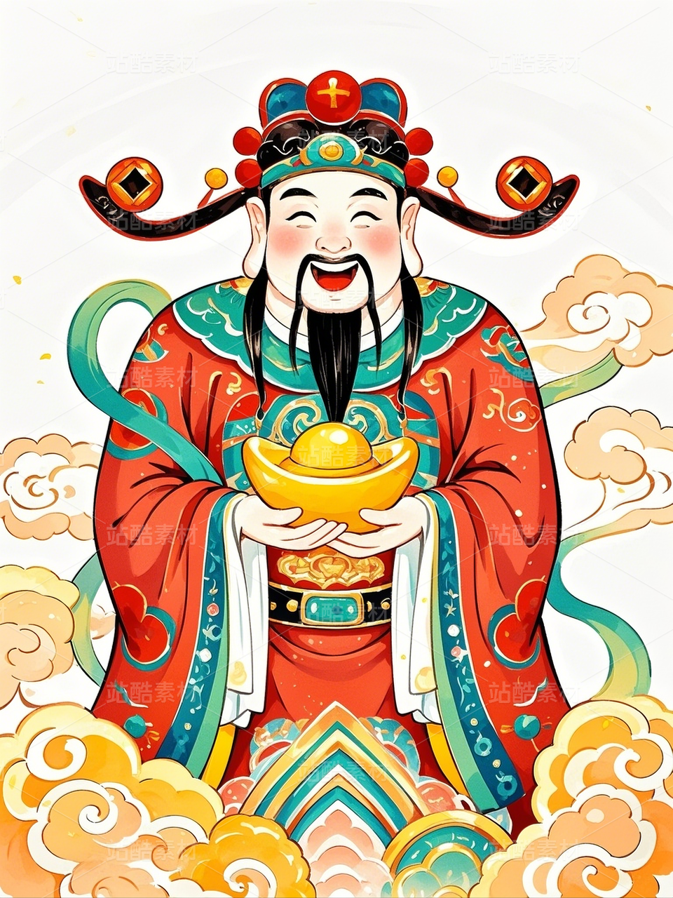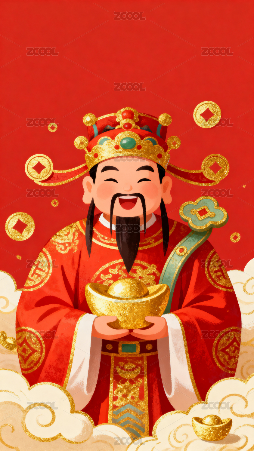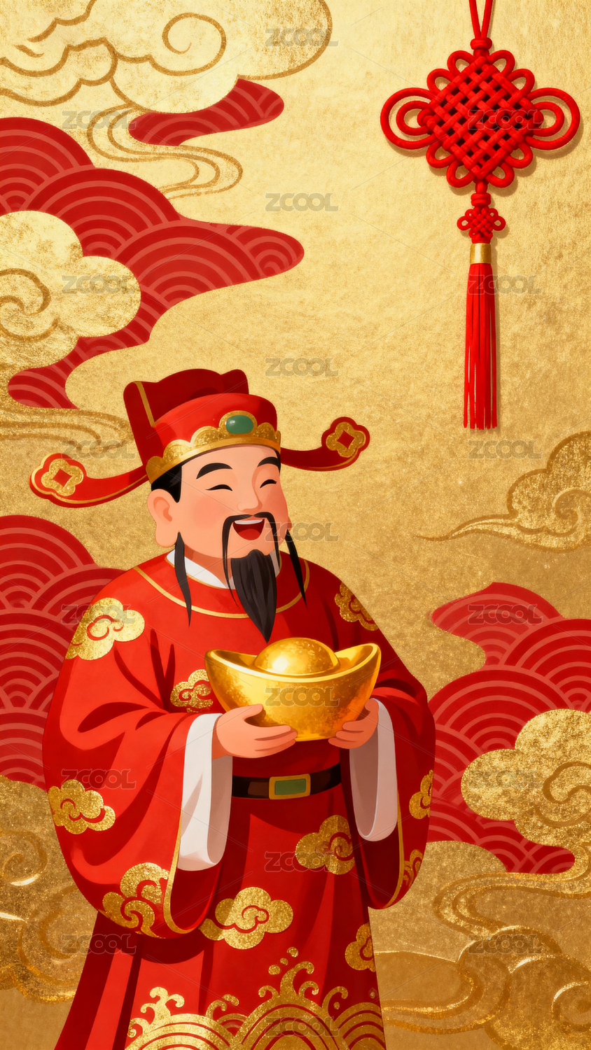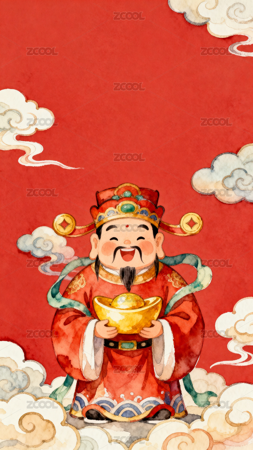 财神爷送元宝祥云背景