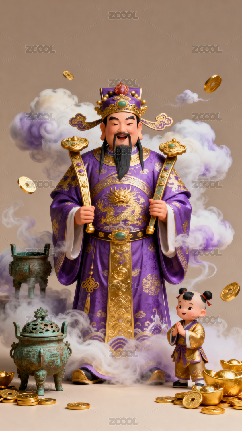 财神爷立体3D插画金币财神