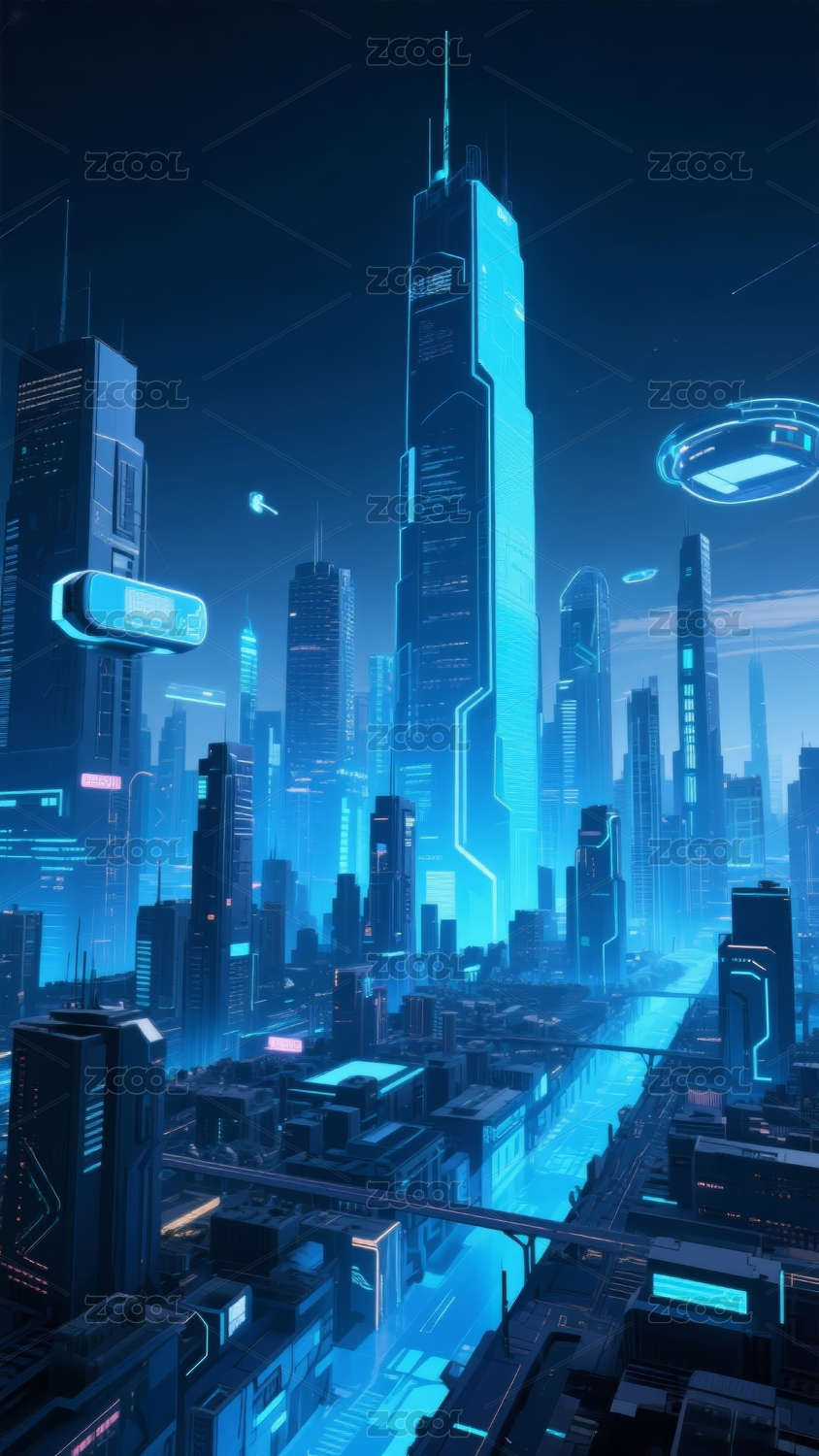 科技,未来感,城市,深蓝,夜晚,星空,紫色,建筑,摩天楼,幻想