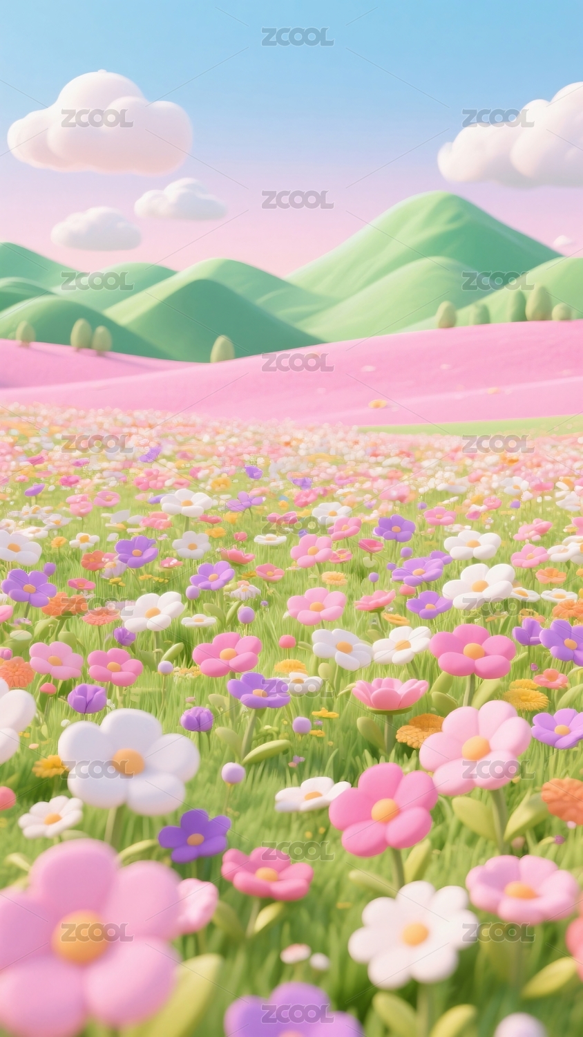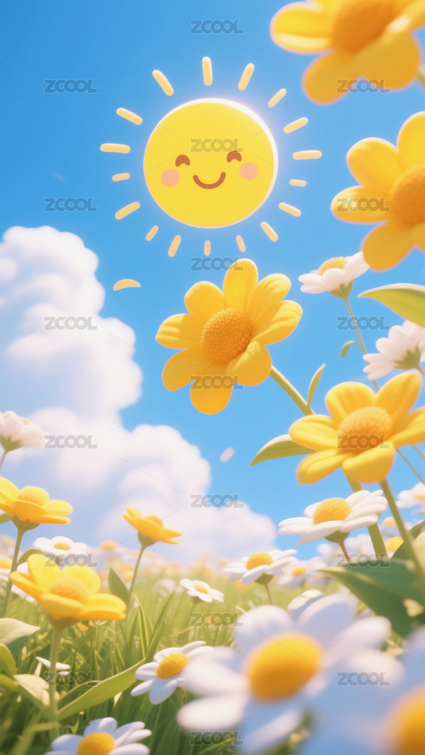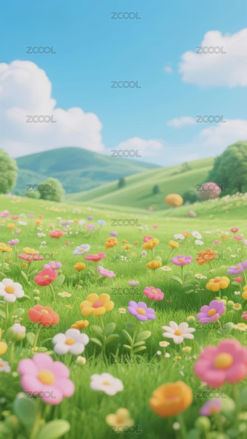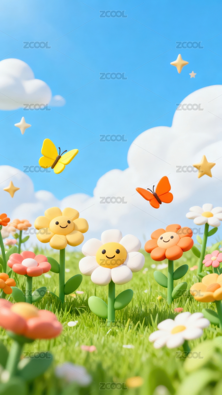 卡通,天空,草地,花朵,白云,绿色,茎,红色,黄色,蝴蝶
