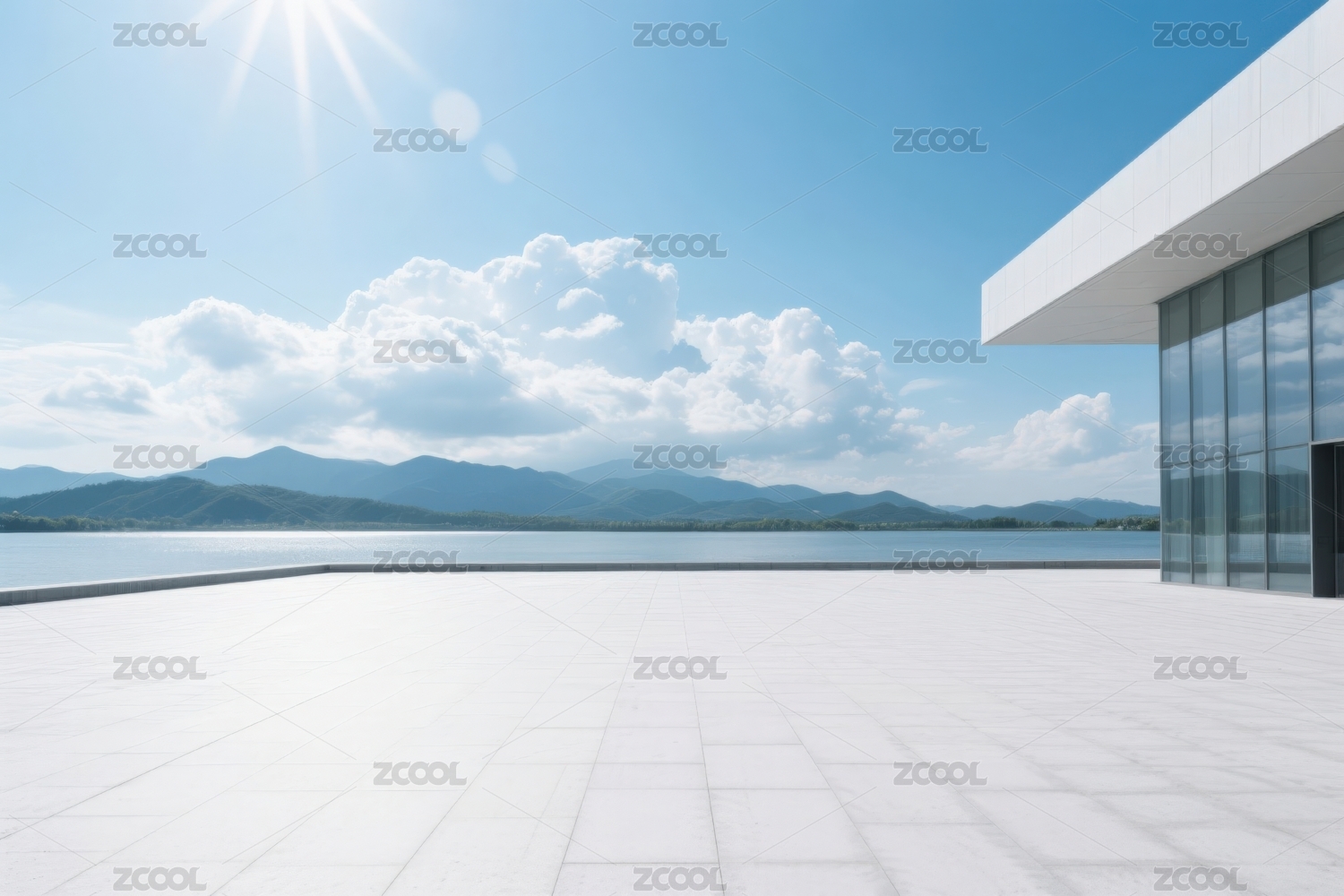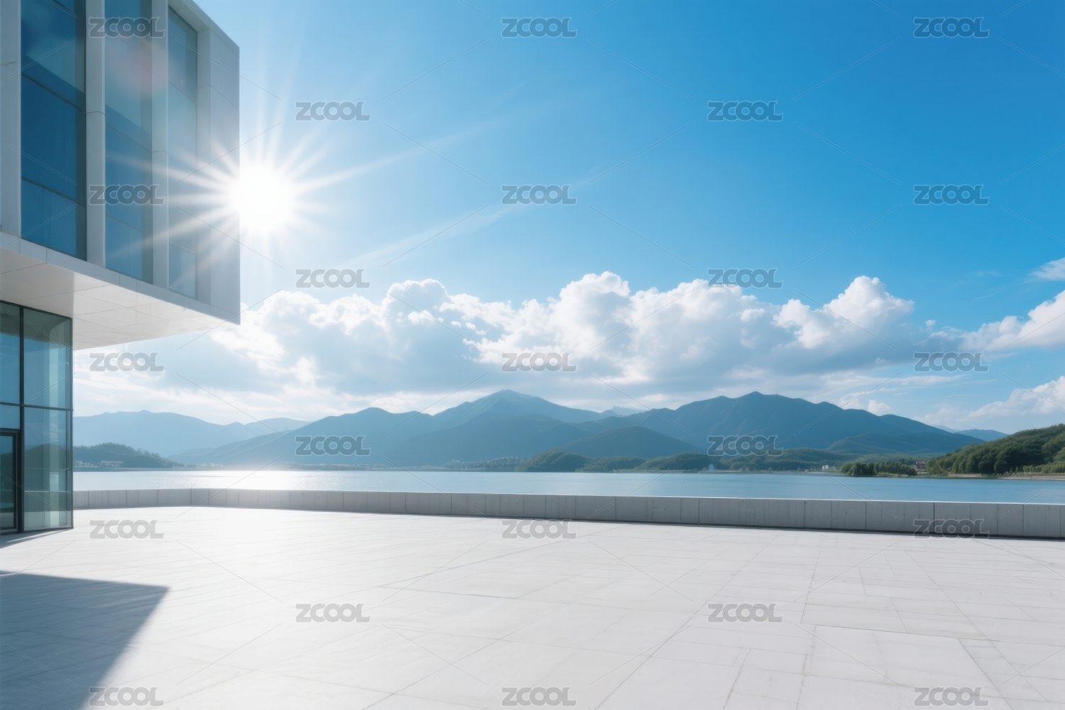 湖畔阳光下的现代建筑