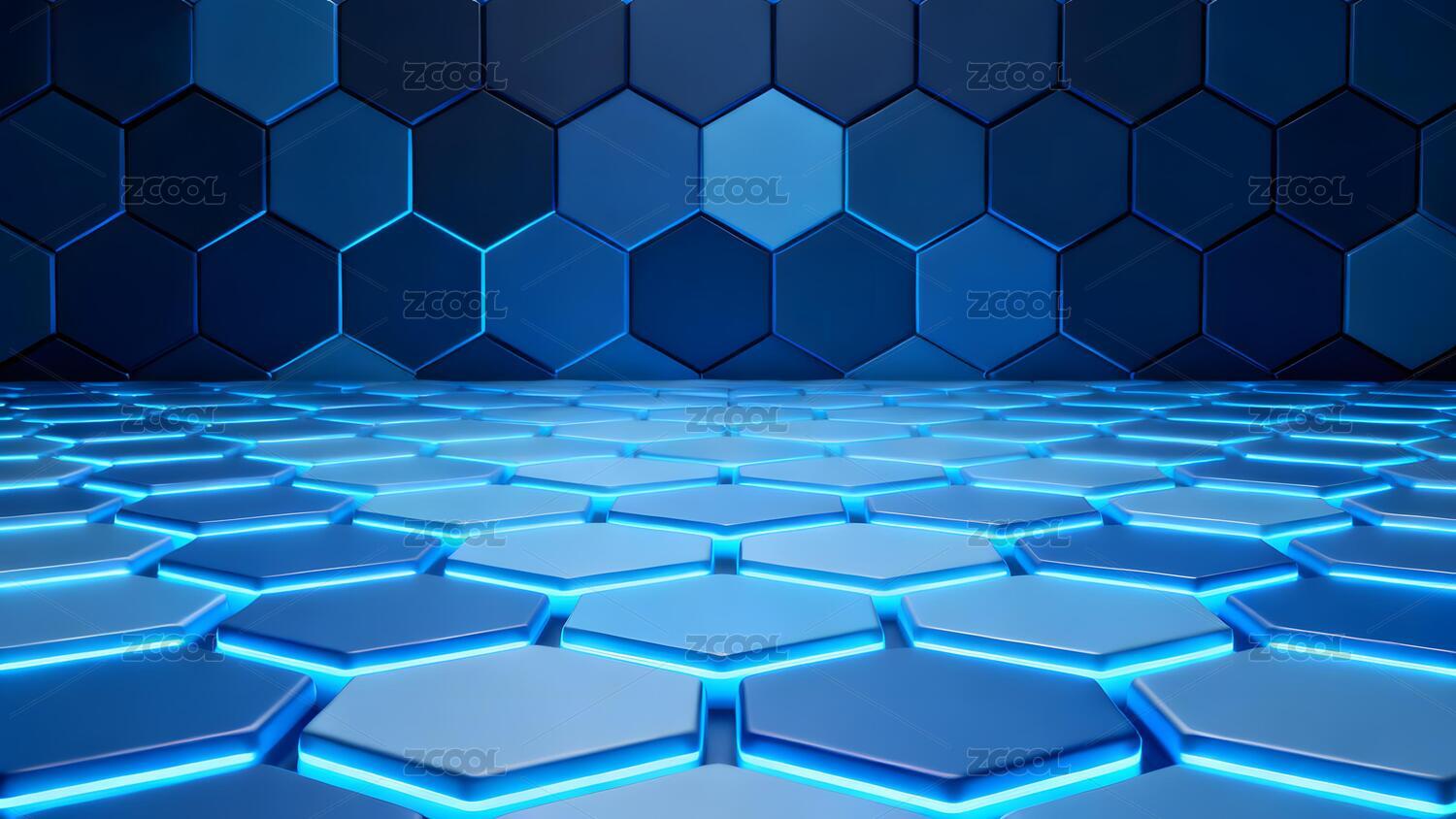 蓝色发光六边形网格地面