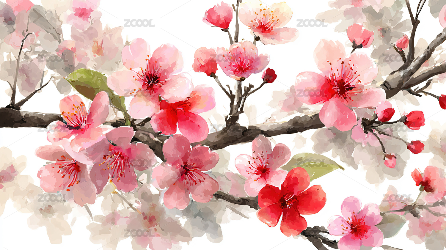 粉色,花瓣,叶子,绿色,背景,花蕊,枝干,花枝,花苞,水墨