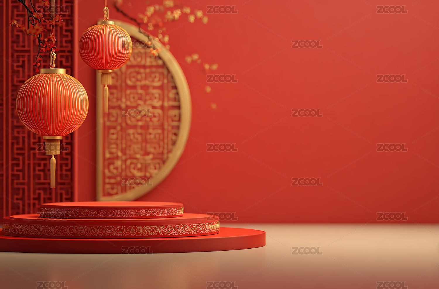 红色,新年,春节,展台,灯笼,窗花,背景,产品展示,电商,C4D软件