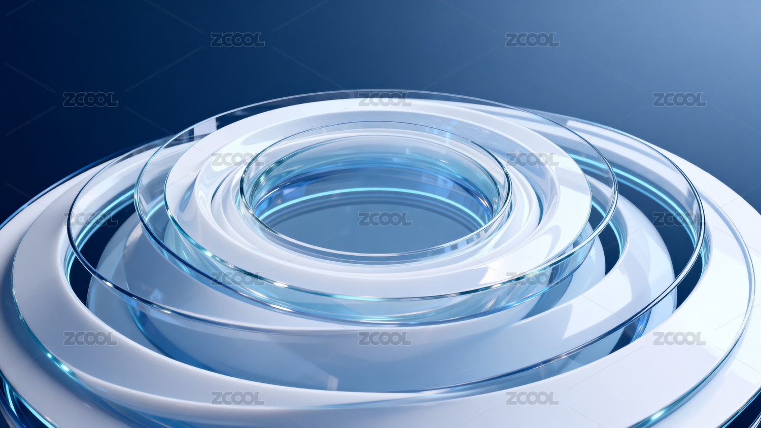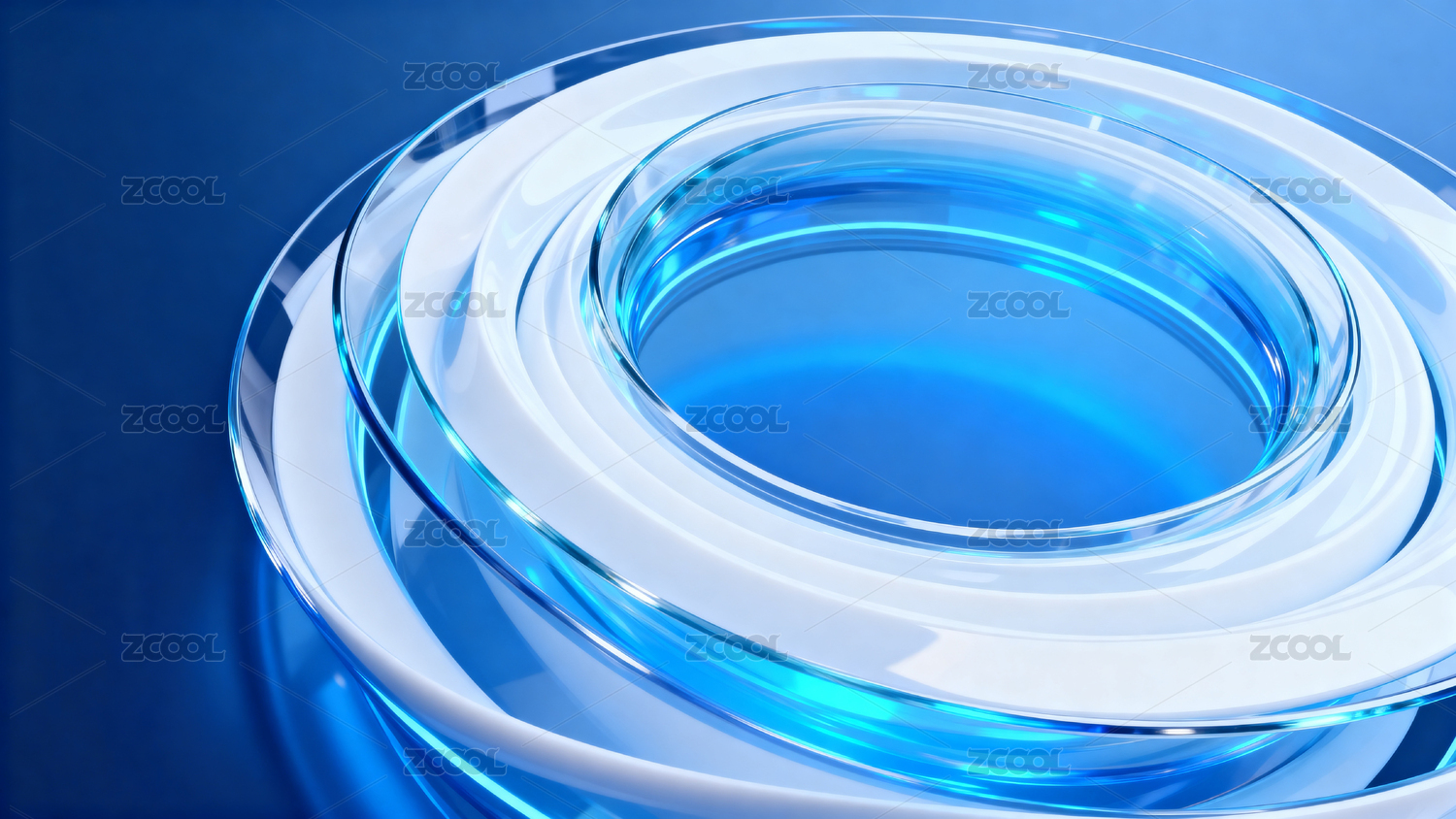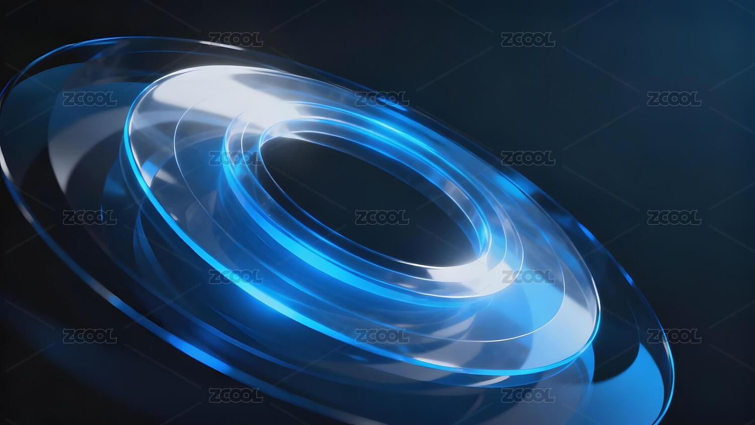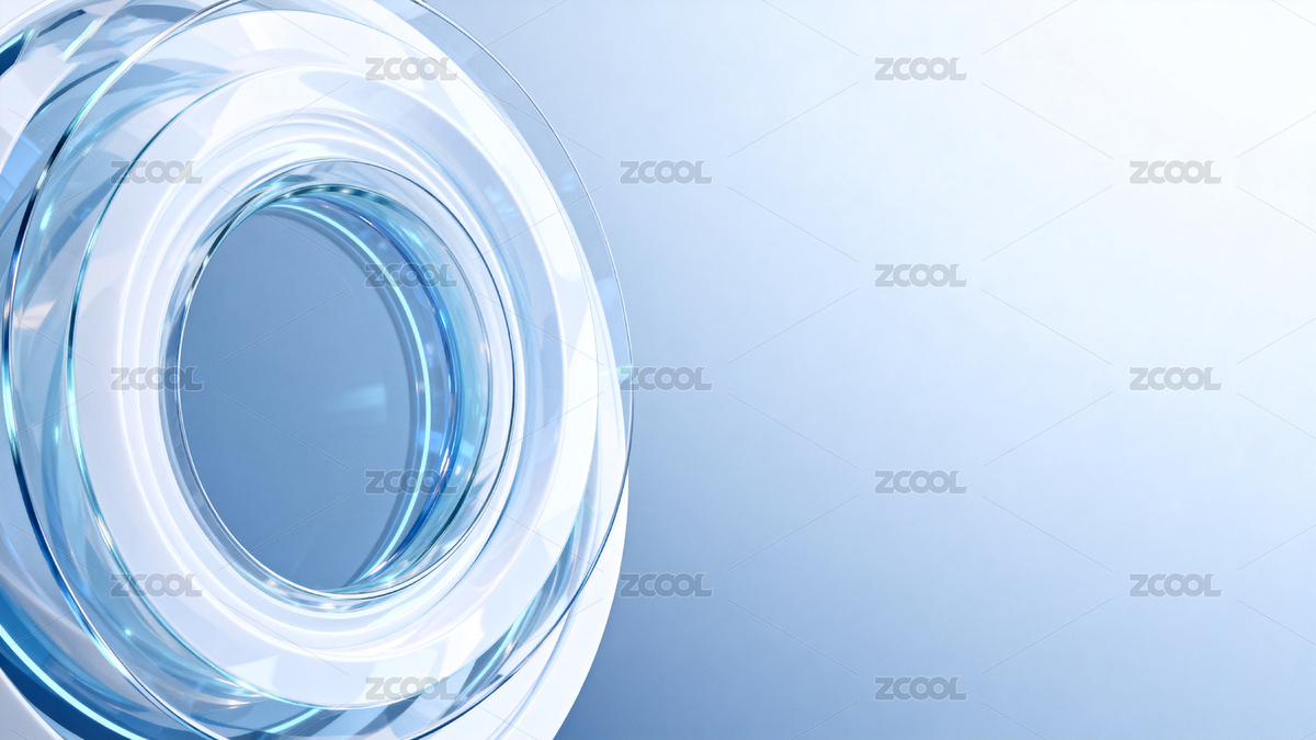 蓝色透明的圆环玻璃特写,干净科技感背景