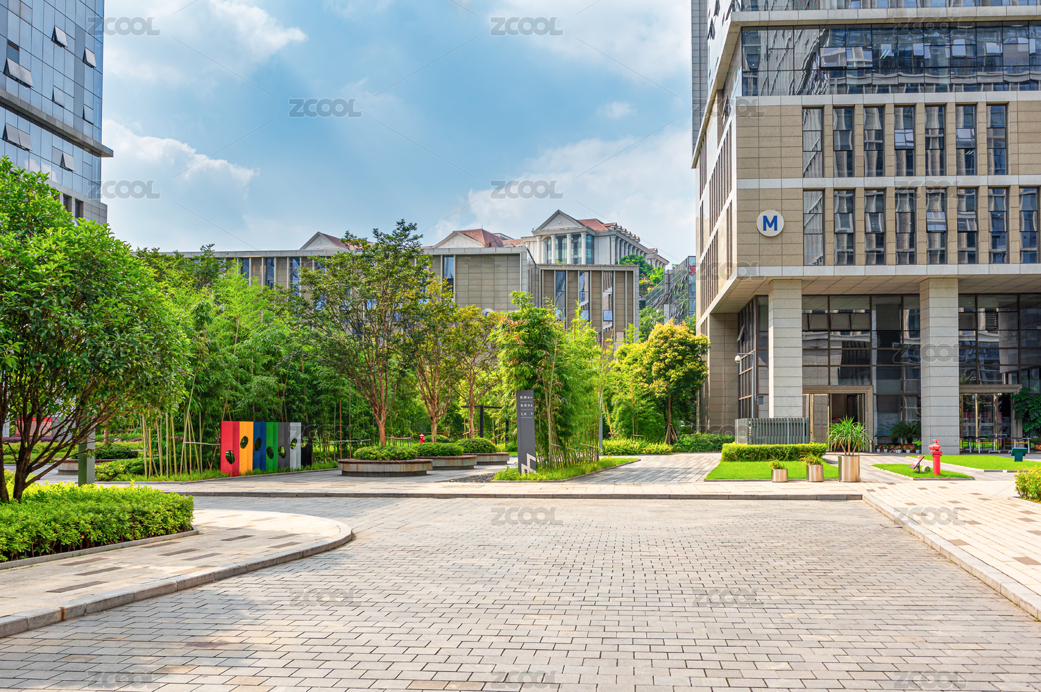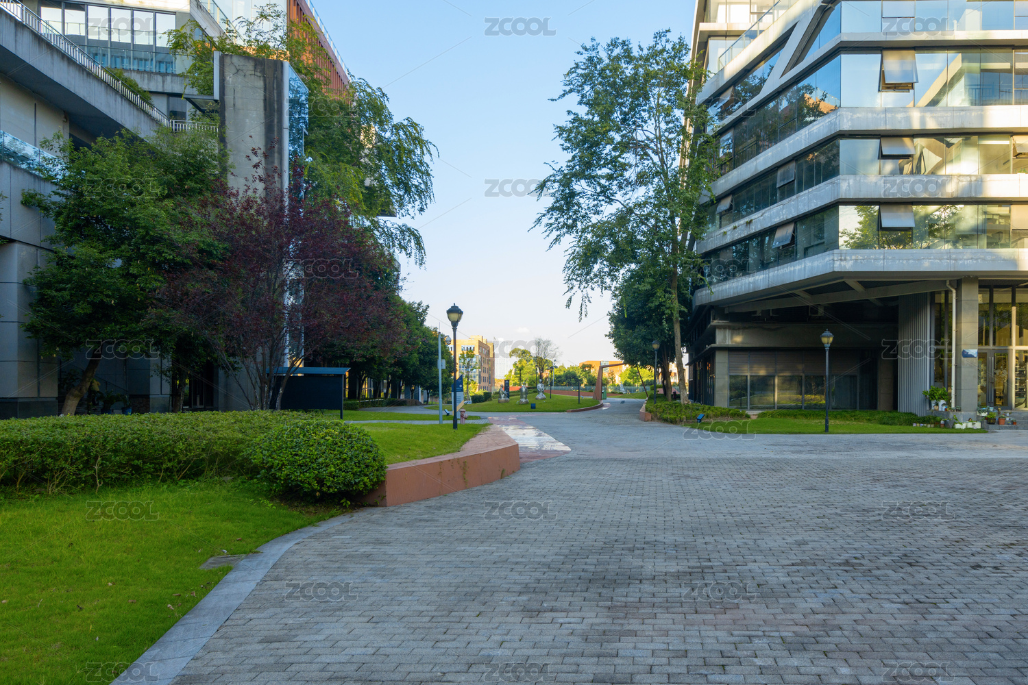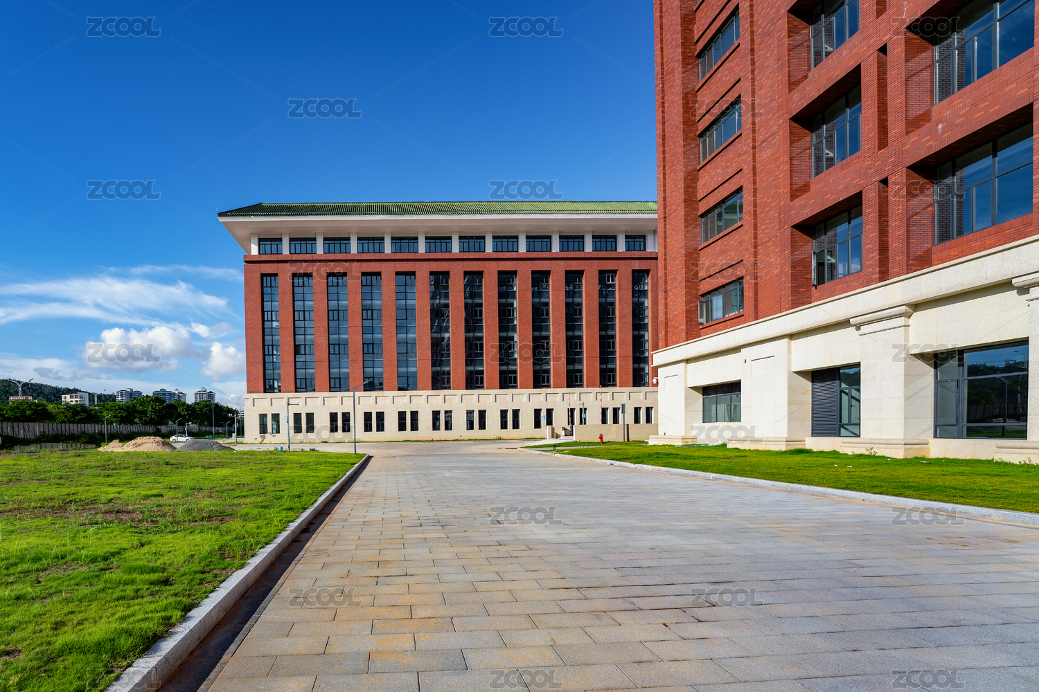 中国福建一处红砖通道及现代玻璃幕墙建筑