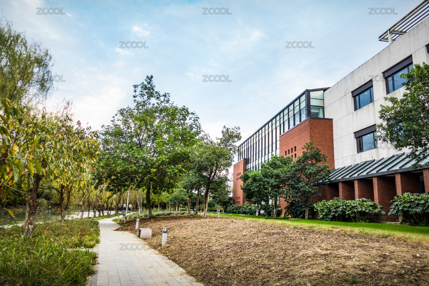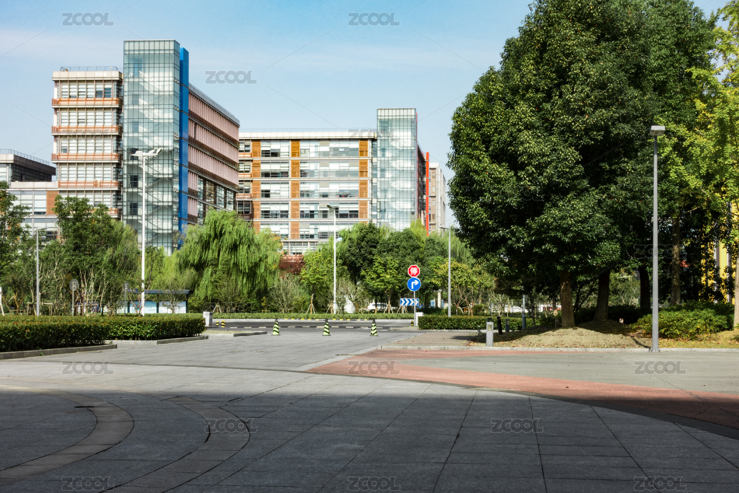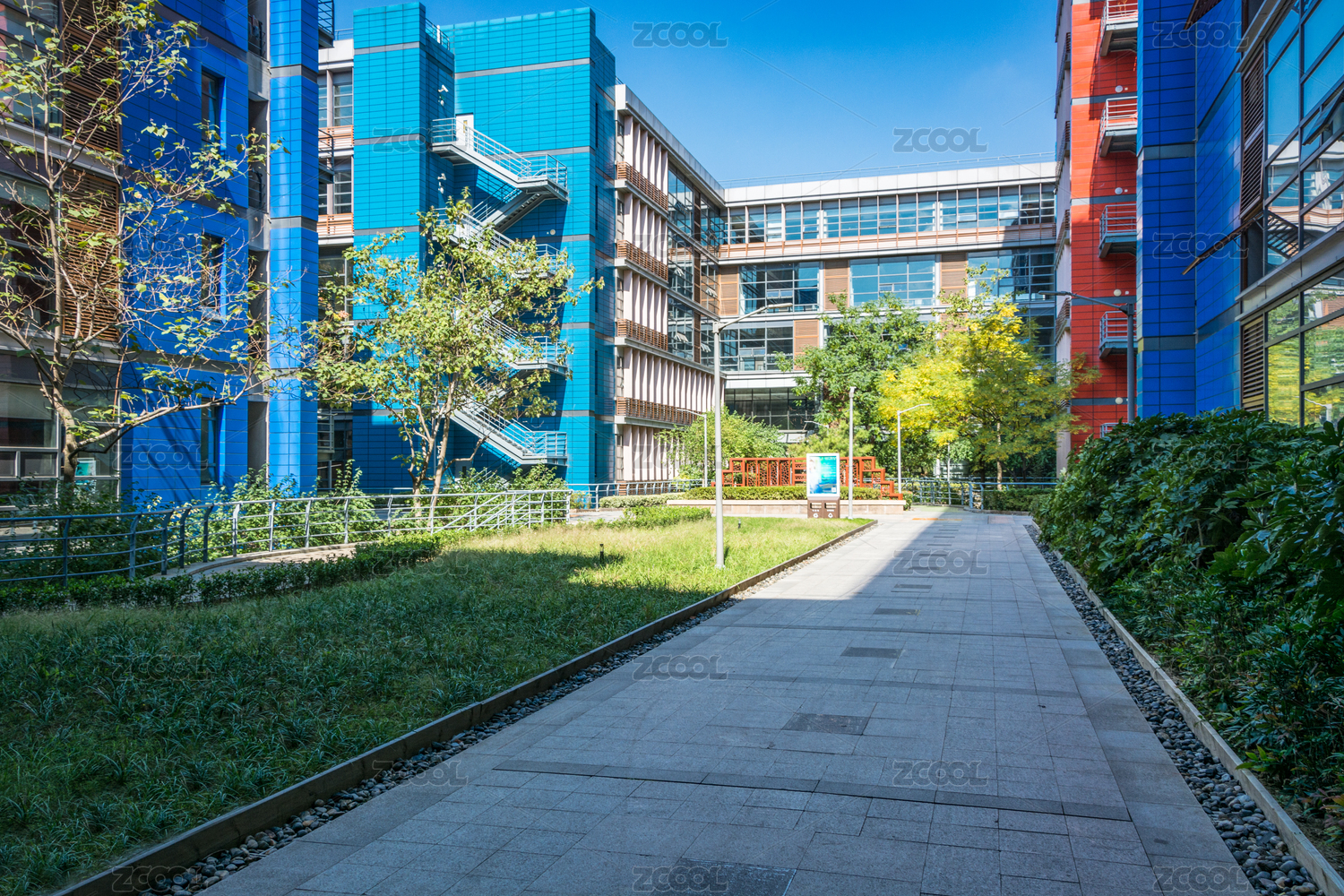 中国福建一处红砖通道及现代玻璃幕墙建筑