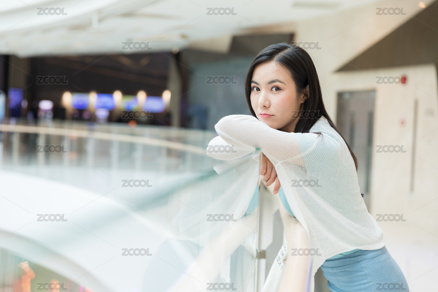 亚洲商务人士拿着手提电脑倚靠在栏杆旁