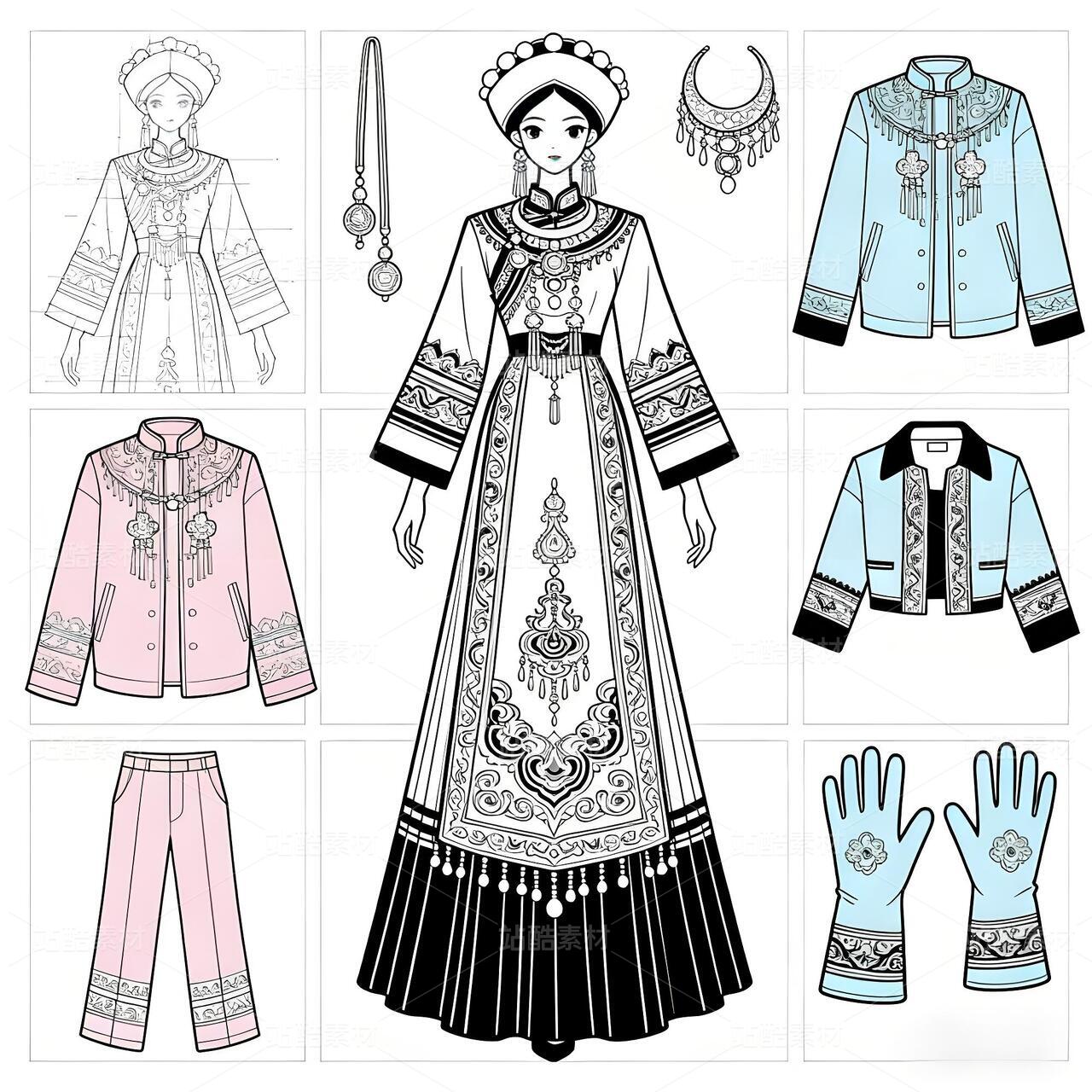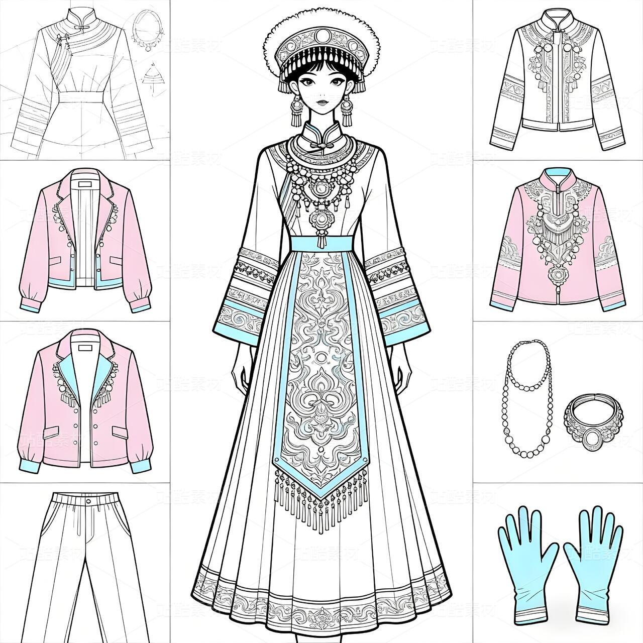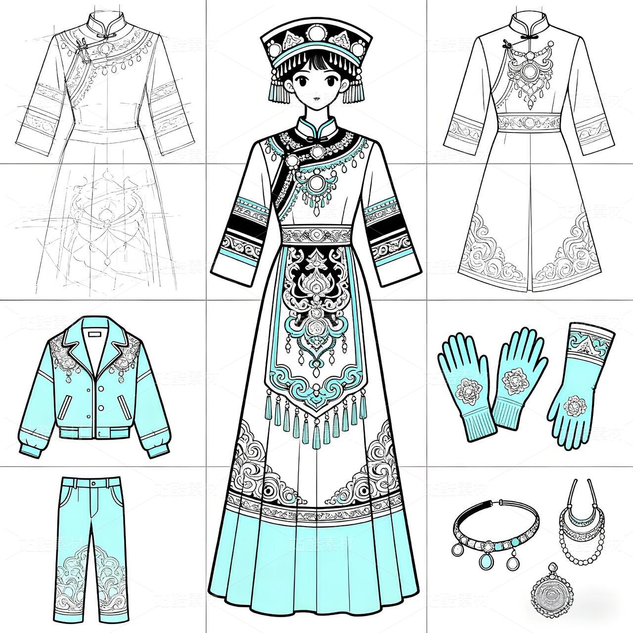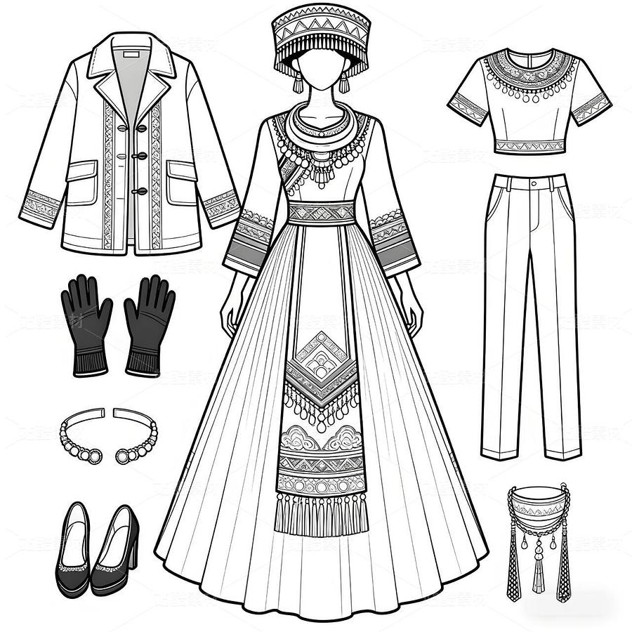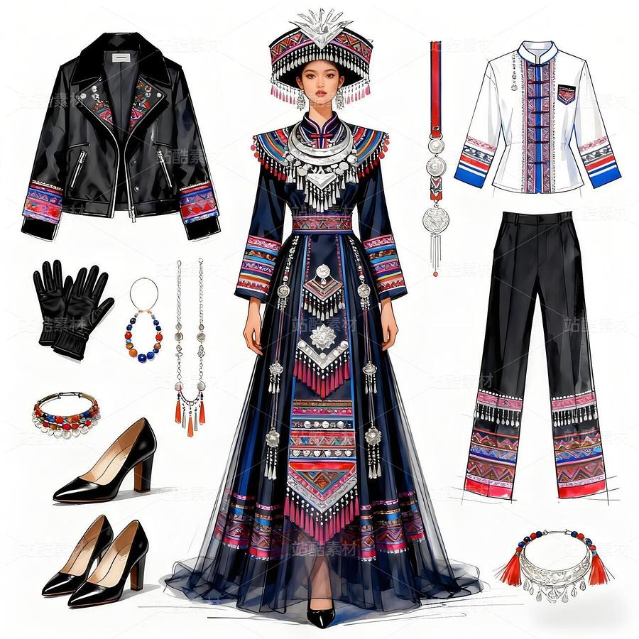 这幅手稿呈现了一套旨在连接传统与当代的高定瑶族礼服。设计师从瑶族深厚的“盘瓠”图腾文化与山地生活印记中汲取灵感,将标志性的八角花、龙犬纹样以精妙的现代立体刺绣工艺,点缀于礼服的肩部与裙摆。廓形上,保留了瑶族传统服饰中的交领右衽与宽大袖型,但通过解构主义手法,以不对称的斜裁线条赋予其流动的现代美感。头饰则是对瑶族经典三角帽的升华,以银色金属丝编织成镂空结构,既保持了民族的身份符号,又呈现出未来主义的大气廓形。整件作品不仅是服装,更是一次关于非遗文化在当代如何传承与焕新的深度对话。