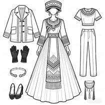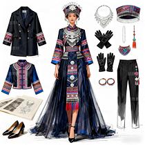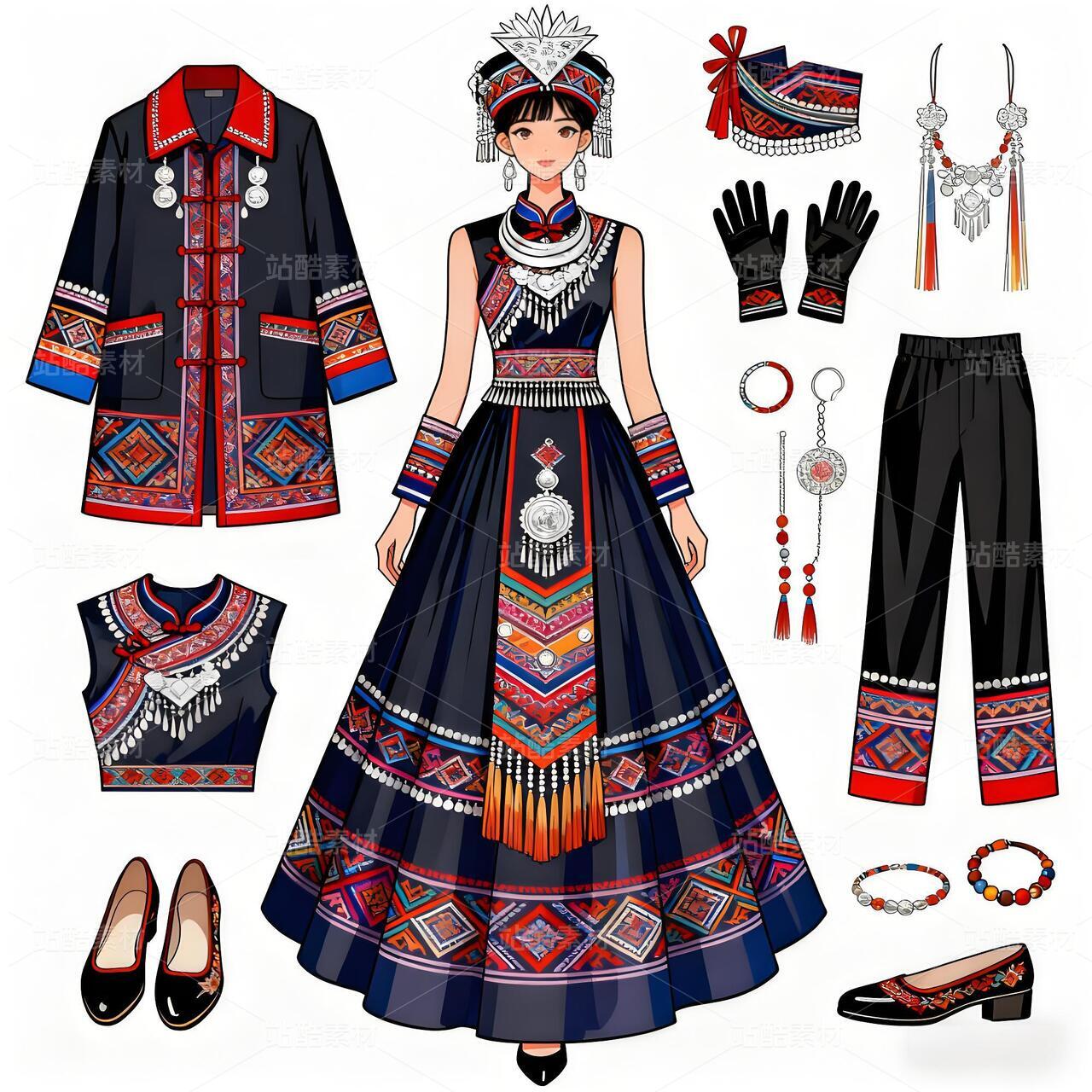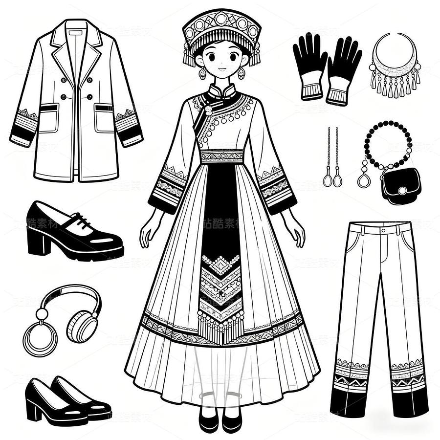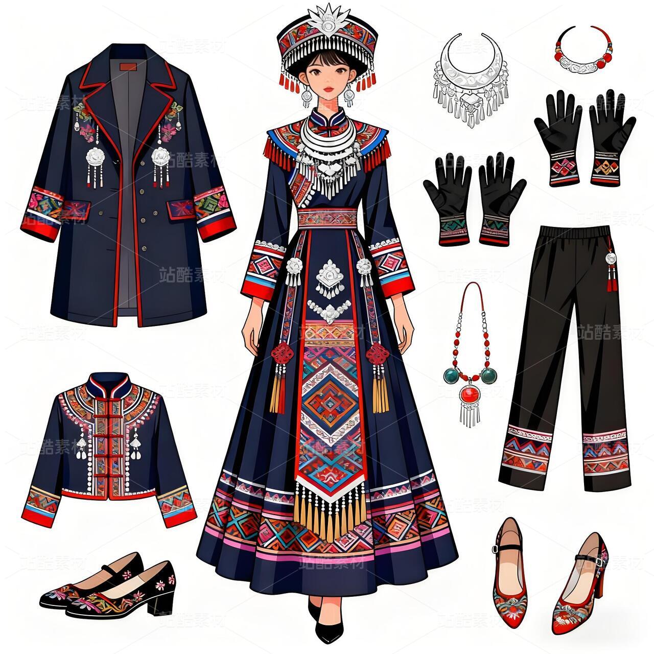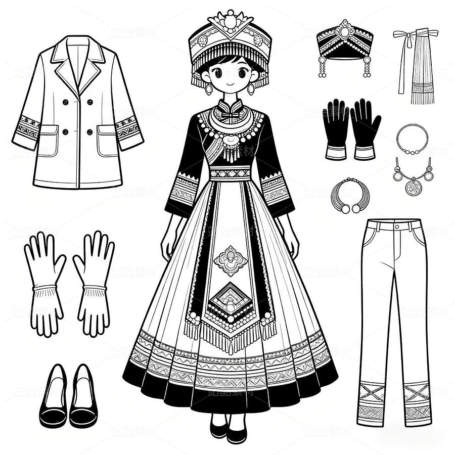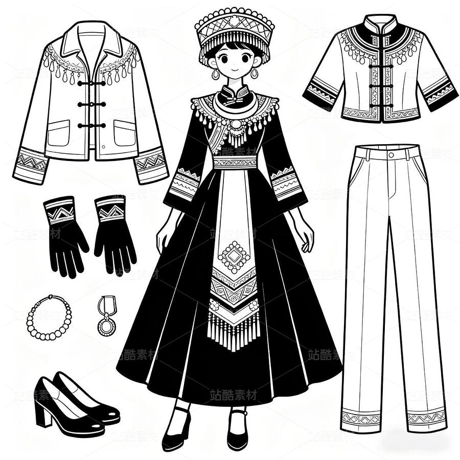 这幅手稿呈现了一套旨在连接传统与当代的高定瑶族礼服。设计师从瑶族深厚的“盘瓠”图腾文化与山地生活印记中汲取灵感,将标志性的八角花、龙犬纹样以精妙的现代立体刺绣工艺,点缀于礼服的肩部与裙摆。廓形上,保留了瑶族传统服饰中的交领右衽与宽大袖型,但通过解构主义手法,以不对称的斜裁线条赋予其流动的现代美感。头饰则是对瑶族经典三角帽的升华,以银色金属丝编织成镂空结构,既保持了民族的身份符号,又呈现出未来主义的大气廓形。整件作品不仅是服装,更是一次关于非遗文化在当代如何传承与焕新的深度对话。
