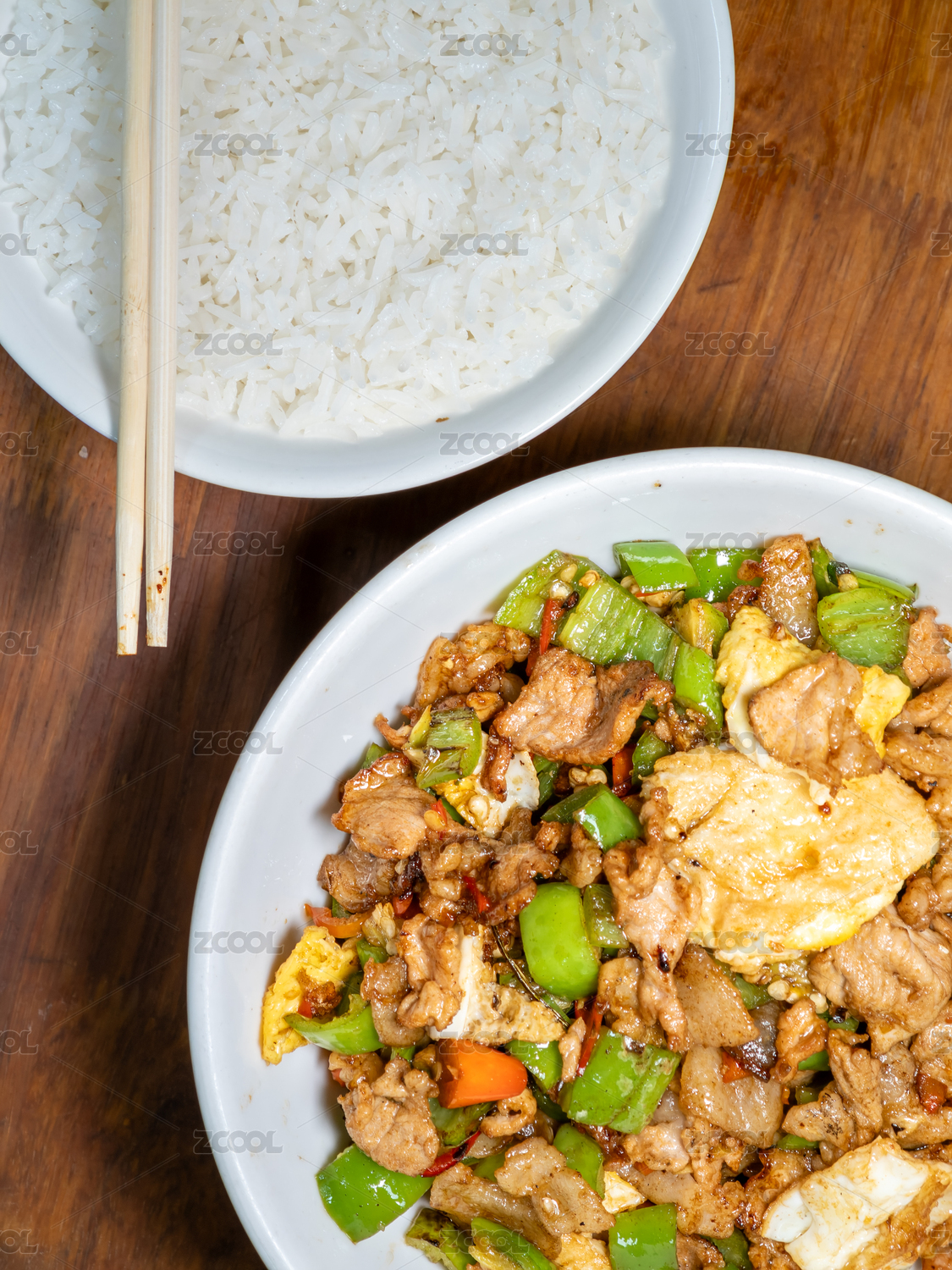 香辣青椒鸡蛋炒肉片鸡蛋和米饭
