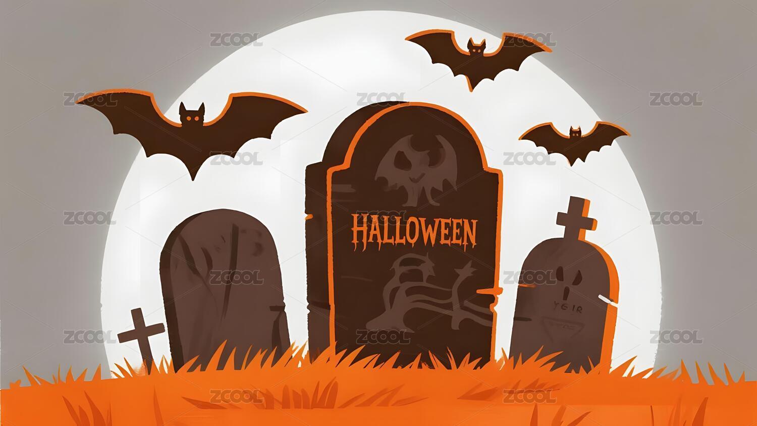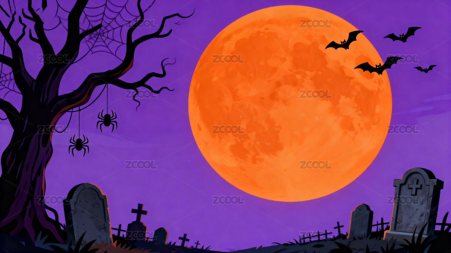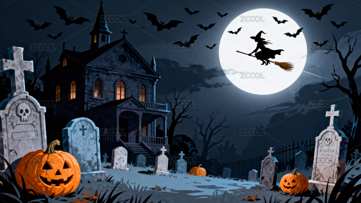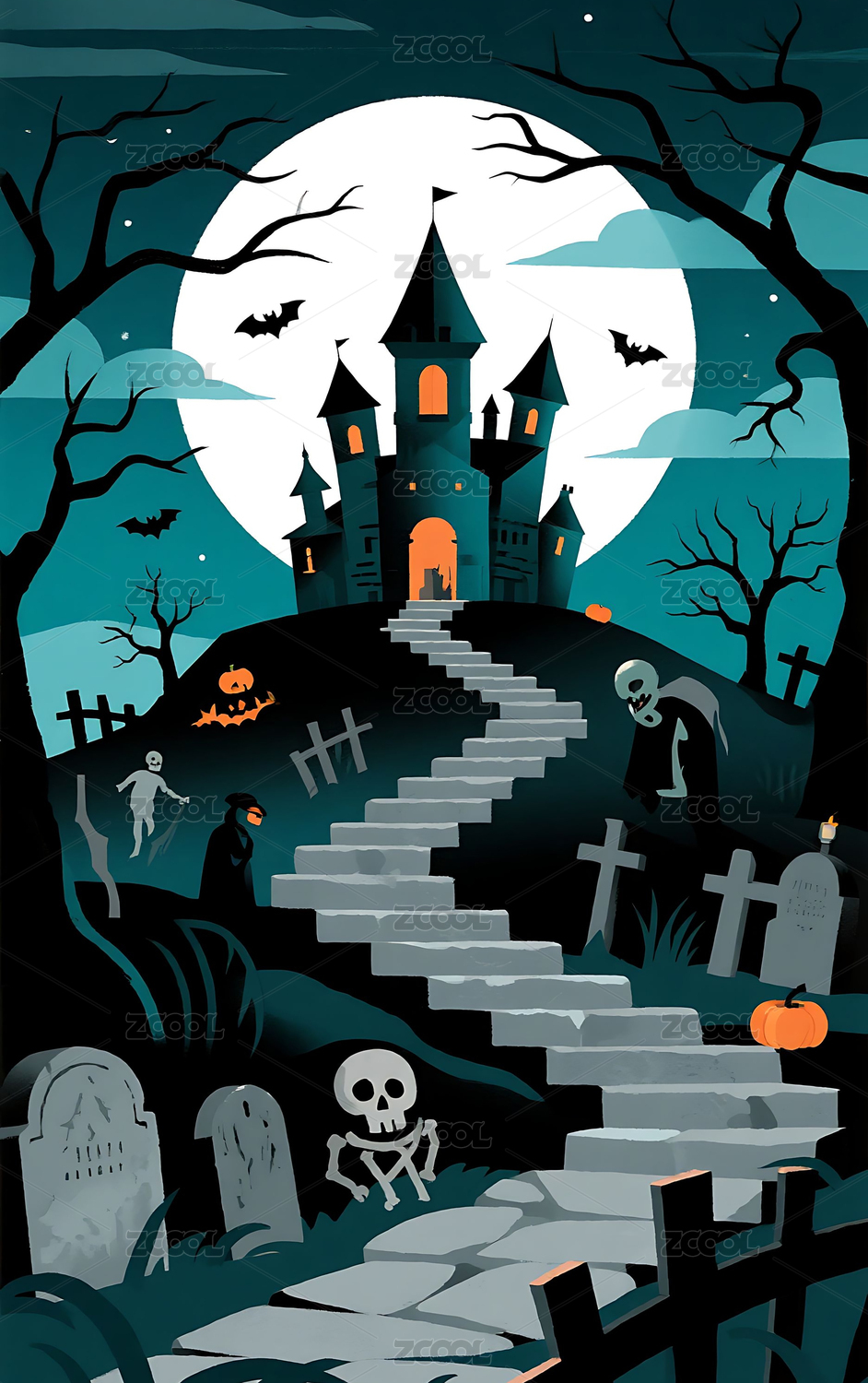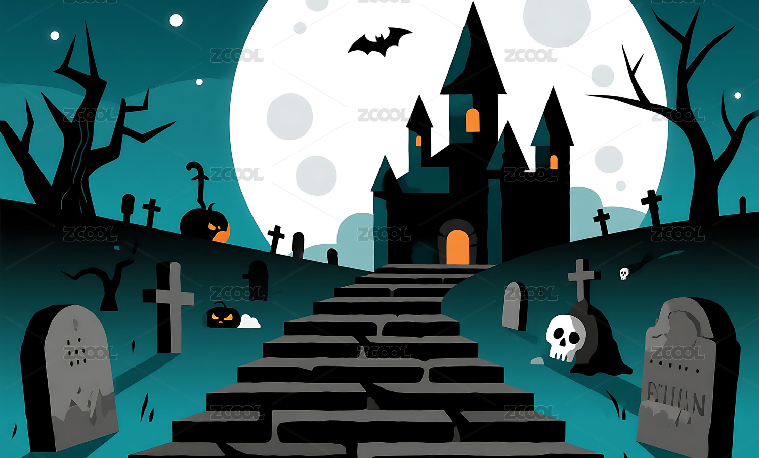 背景,万圣节,夜晚,城堡,平面插画,壁纸,插画,扁平风格,月亮,蝙蝠