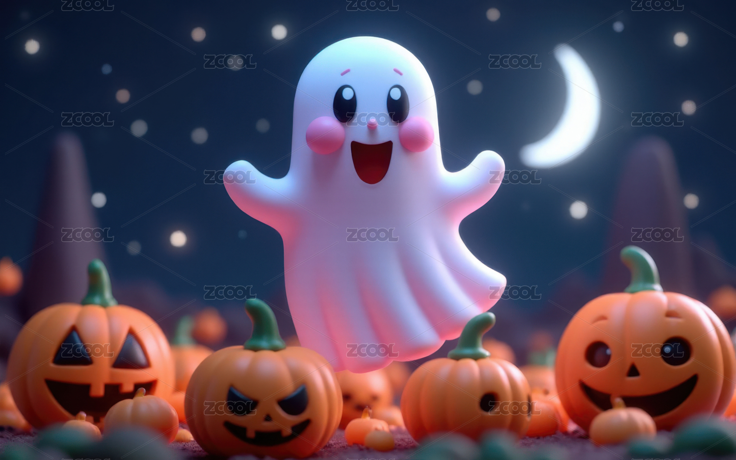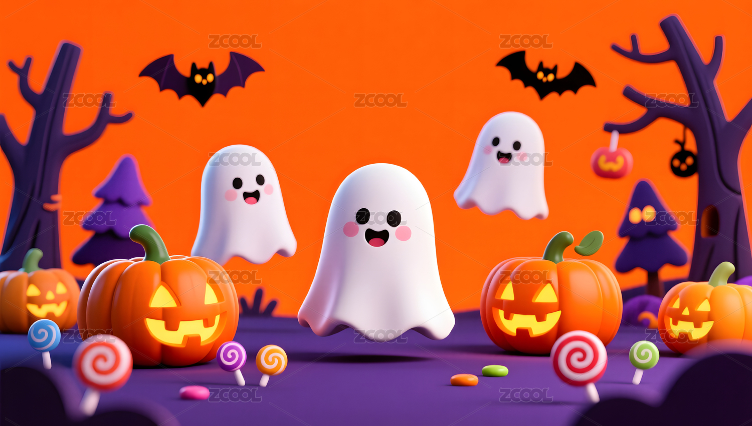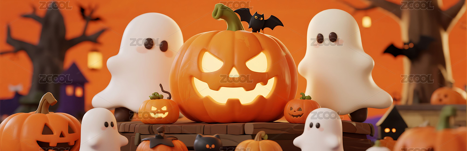 万圣节3D南瓜幽灵插画背景壁纸