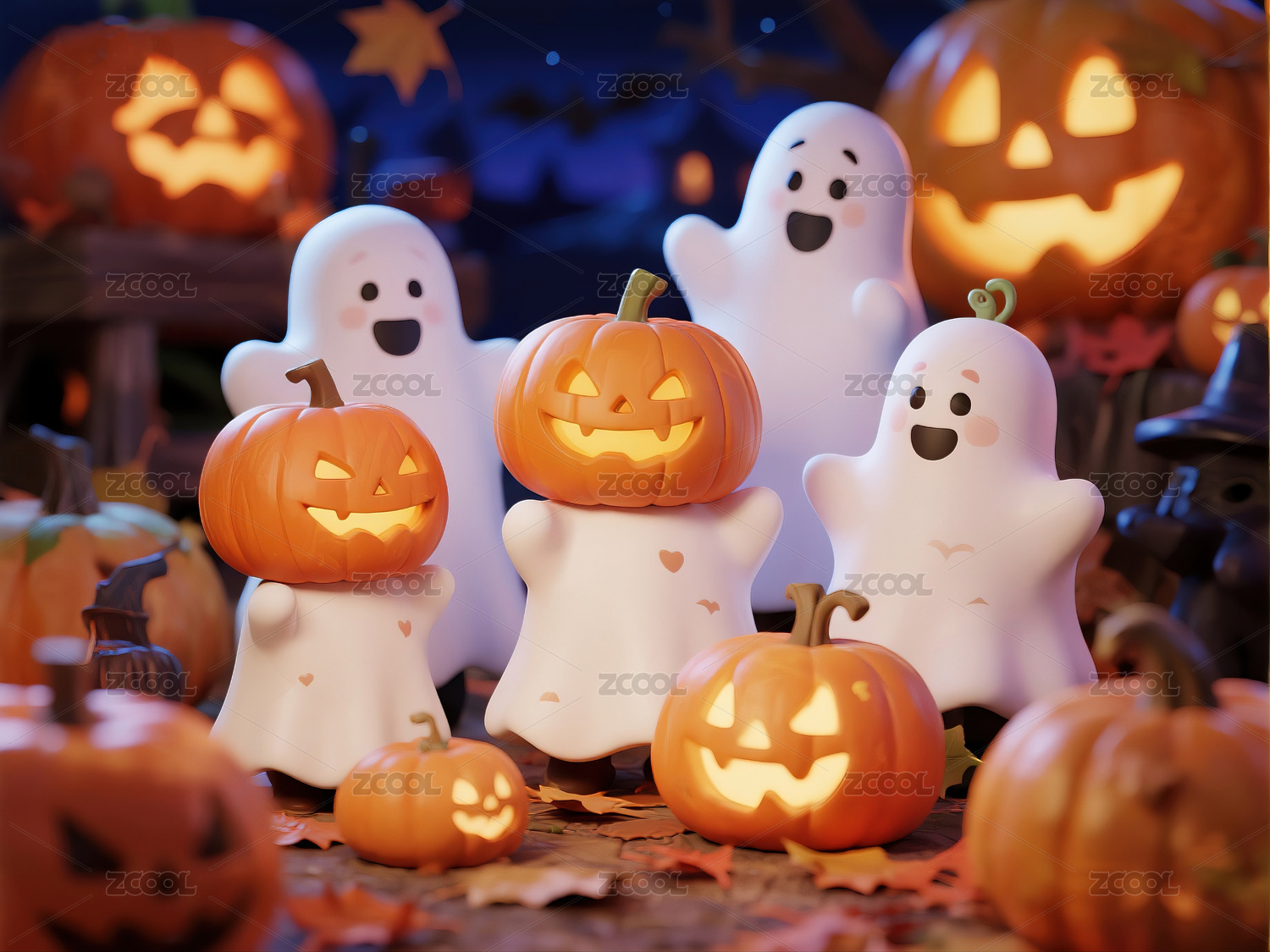 3D卡通可爱幽灵和南瓜落叶的万圣节背景