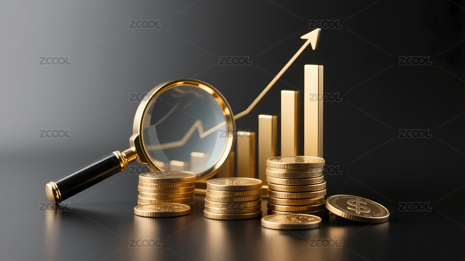 金色图表与放大镜展示增长趋势